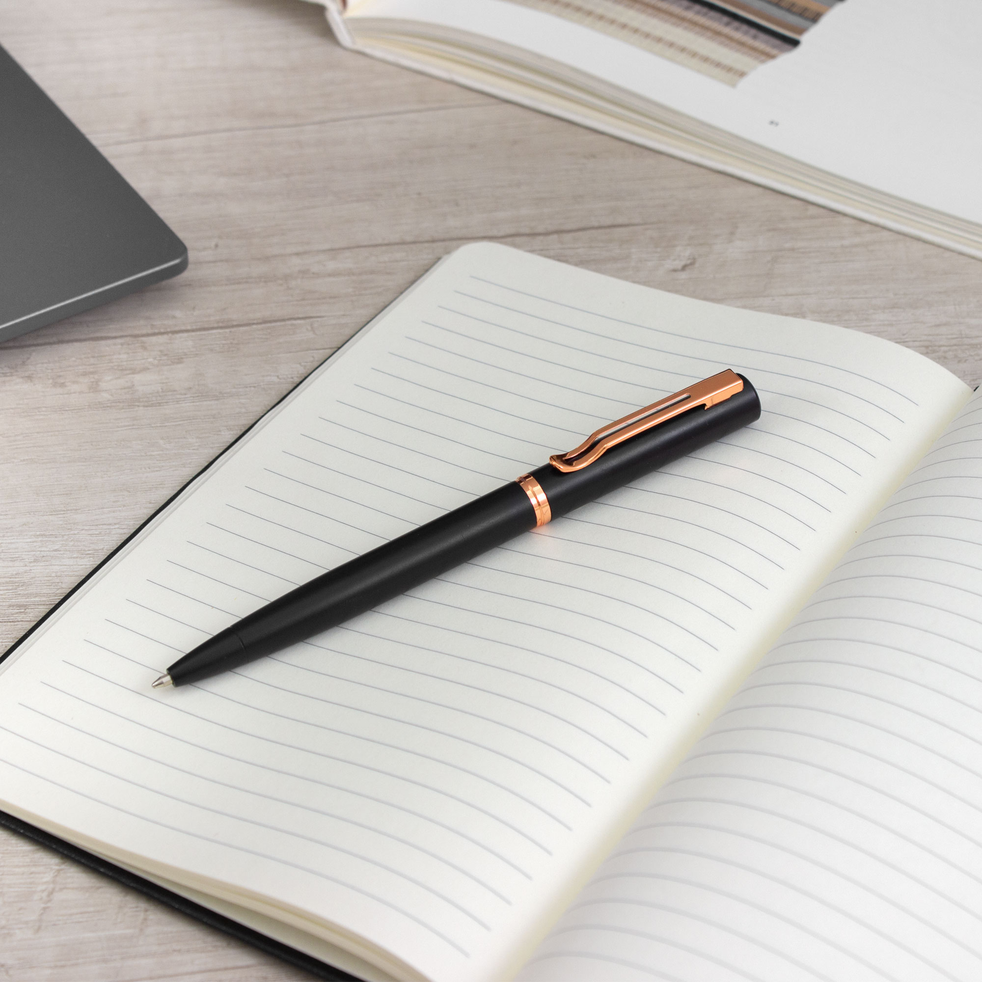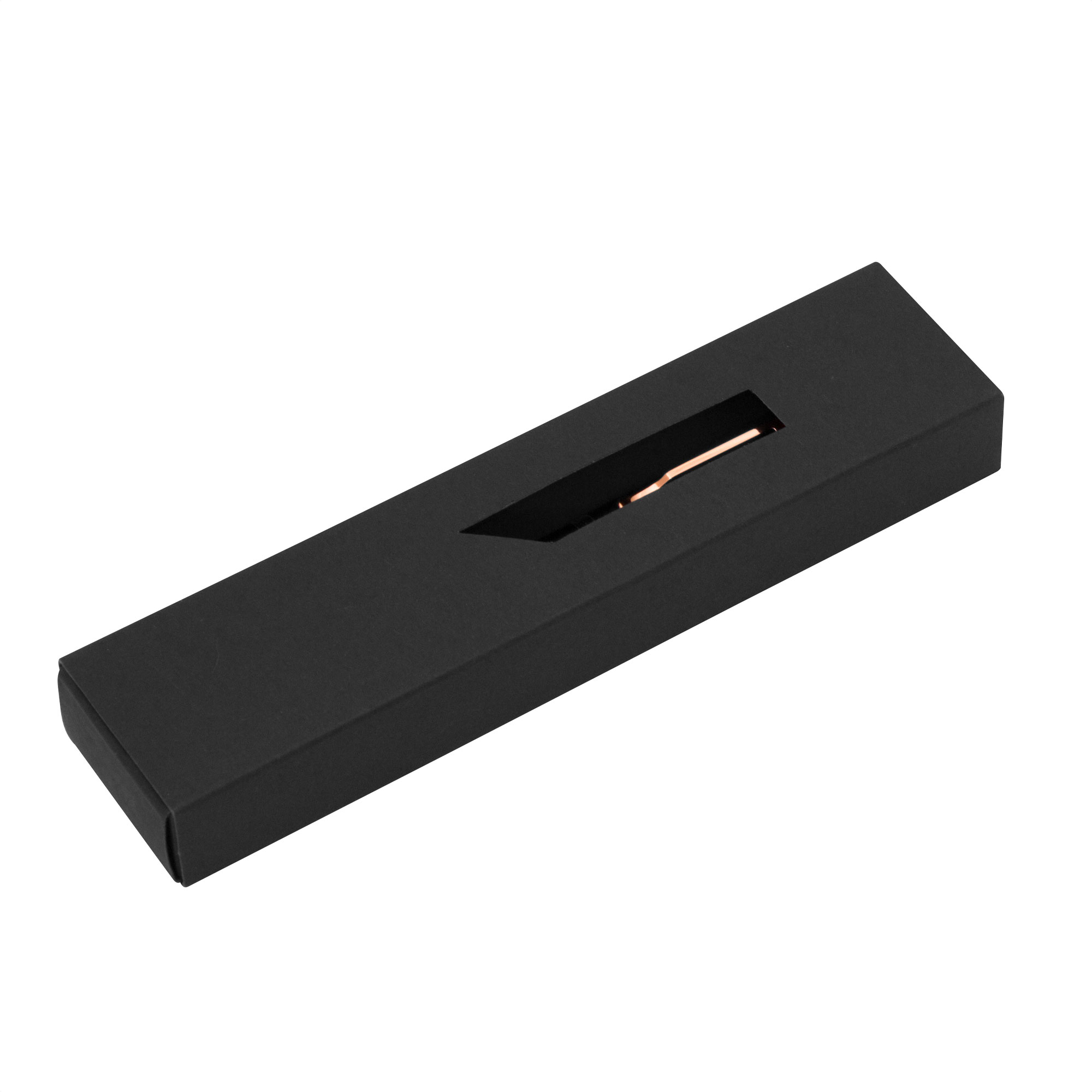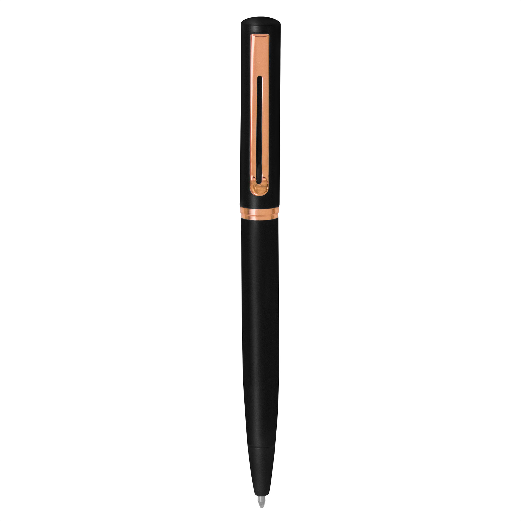 Lujo y sofisticación.Bolígrafo con apertura giratoria. Cuerpo metálico en negro mate. Parte superior de hierro y parte inferior de acero inoxidable. Destape electroplateado en gold rose en la parte superior. Recarga Parker metálico. Clip y anillos metálicos color gold rose. Medidas: 13,5 cm.