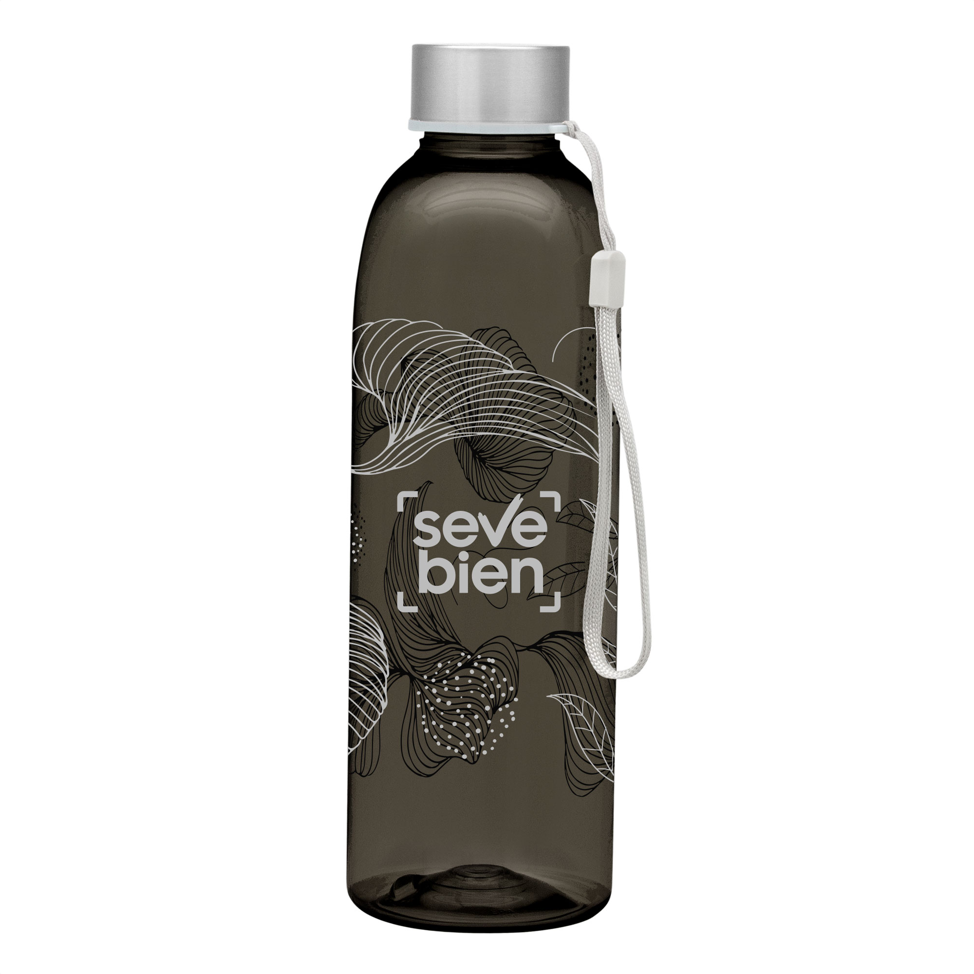 Botella de color translúcido con tapa a rosca de acero inoxidable, anillo de silicona antiderrame y correa para transportar.