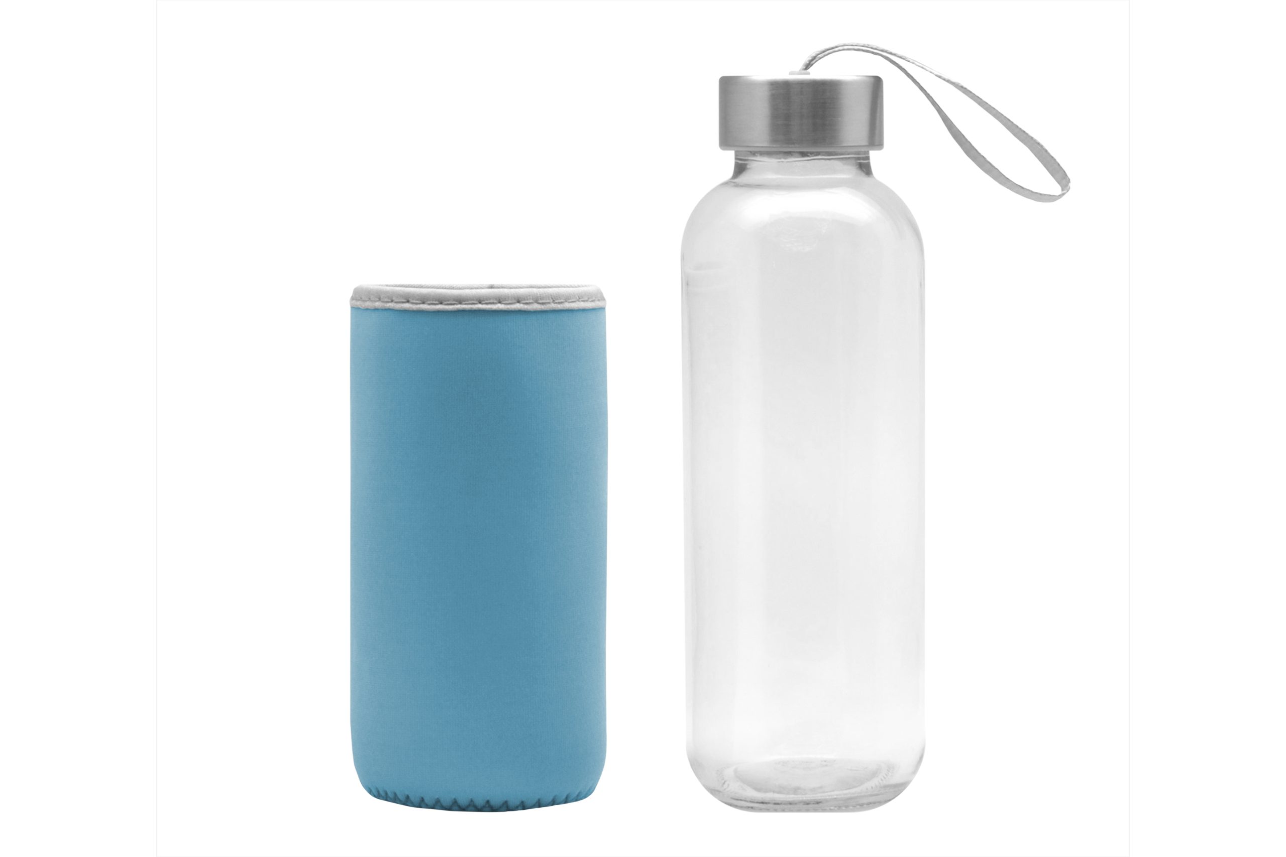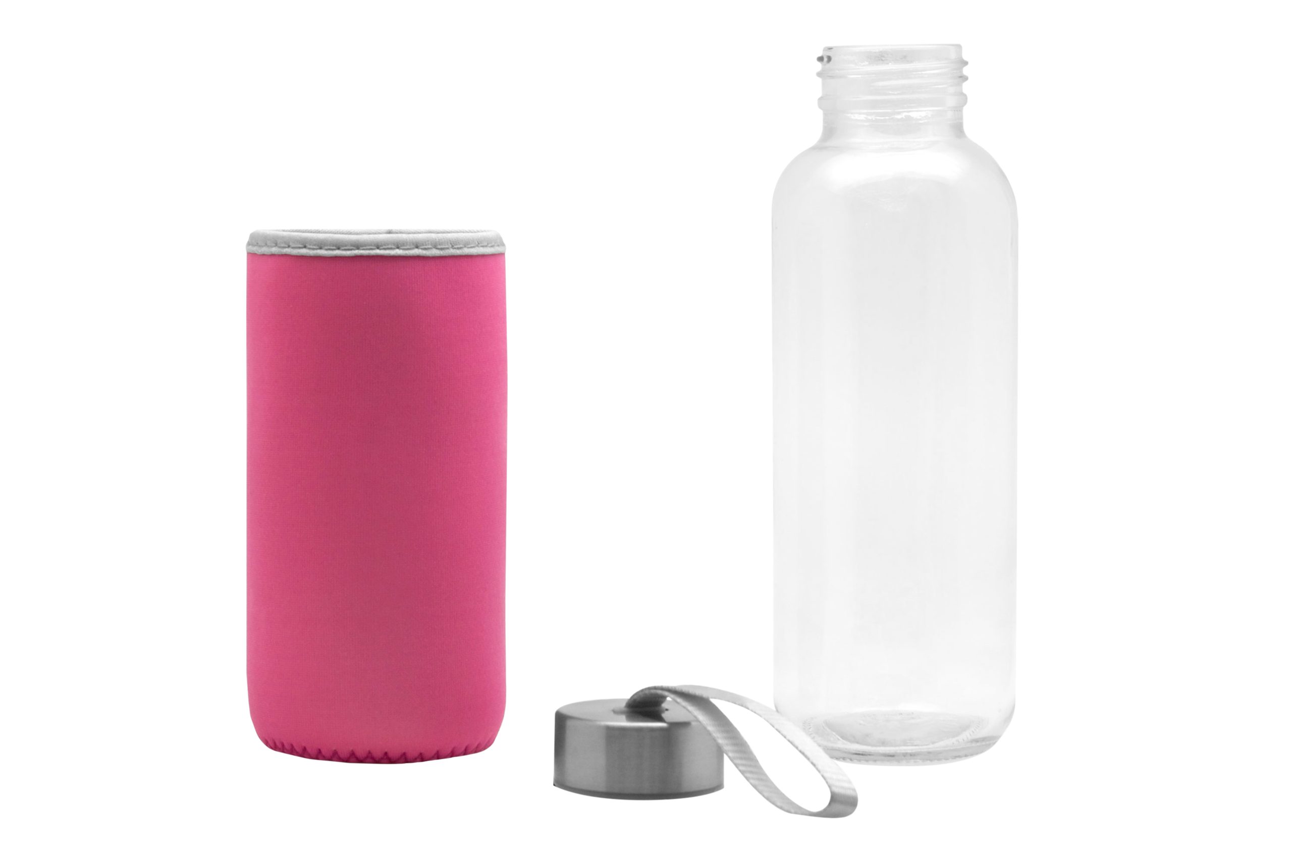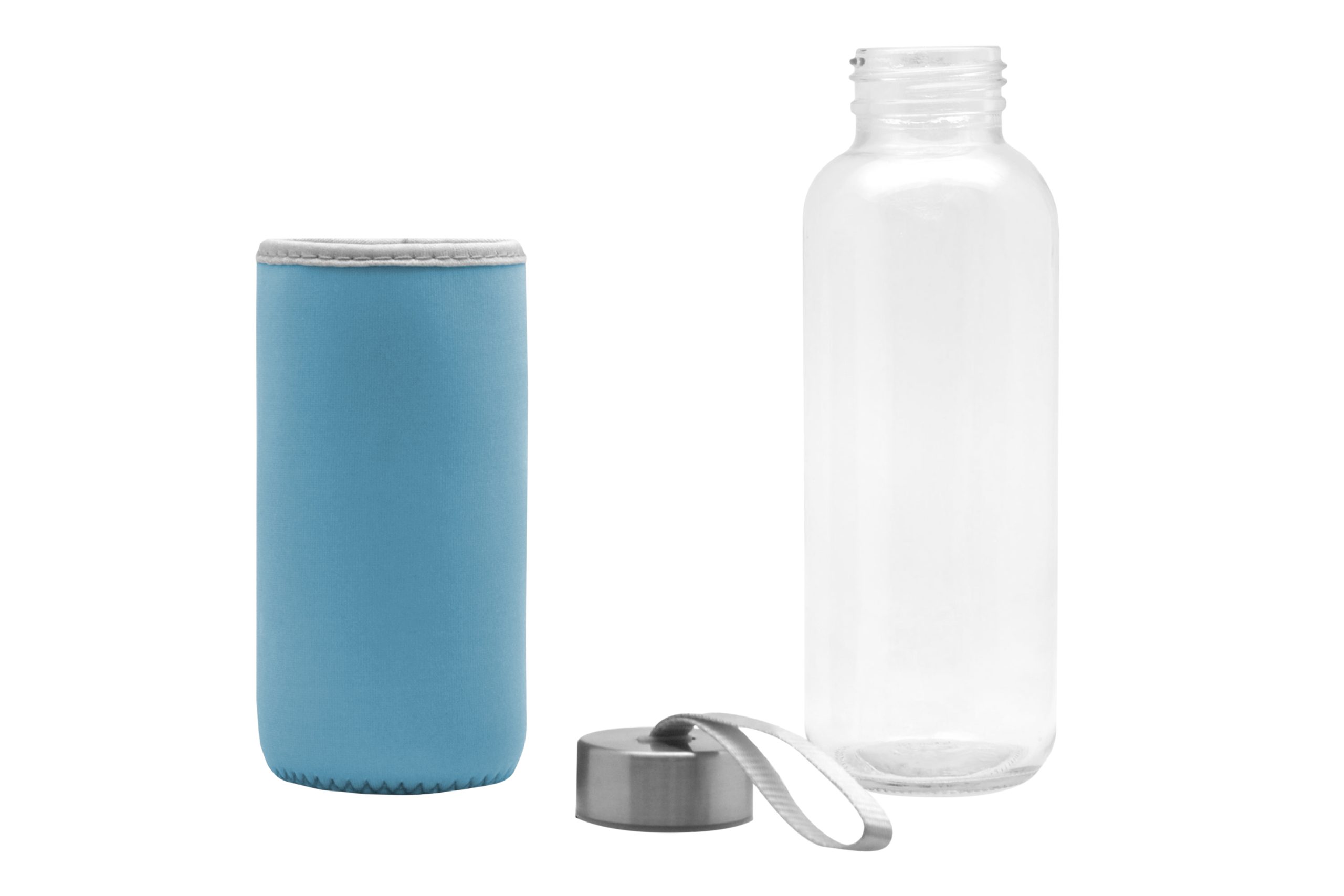 Ø 5,5 x 19,5 cm. Capacidad 440 ml. Vidrio. Cuerpo traslúcido. Funda de neopreno para proteger la botella y mantener la temperatura de las bebidas. Tapa de acero inoxidable con tira de tela. Botella apta para microondas y lavavajillas. Tapa y funda no pueden ser expuestos a estos electrodomésticos. Presentación en caja de regalo.
