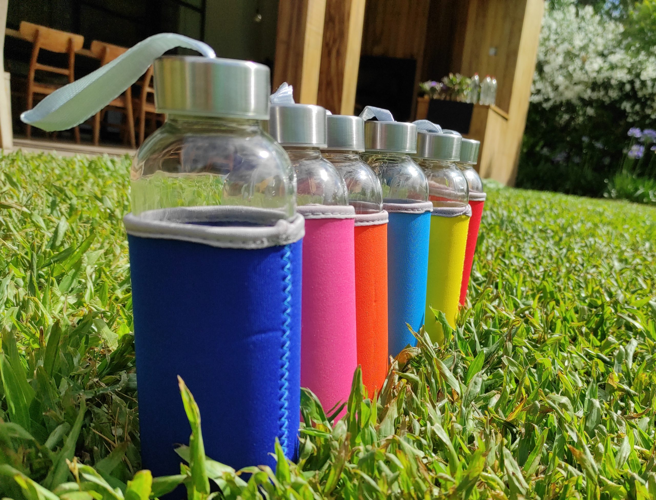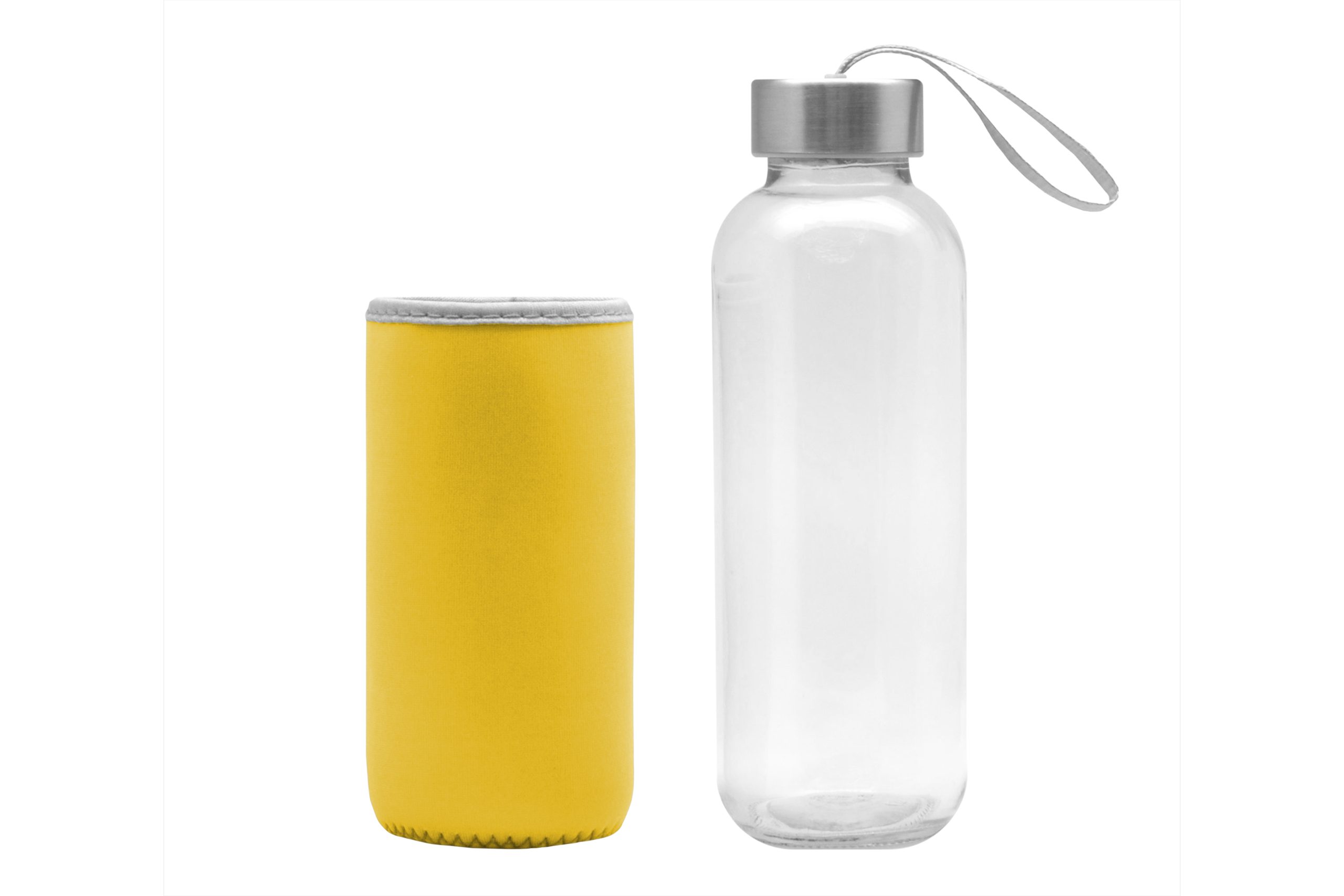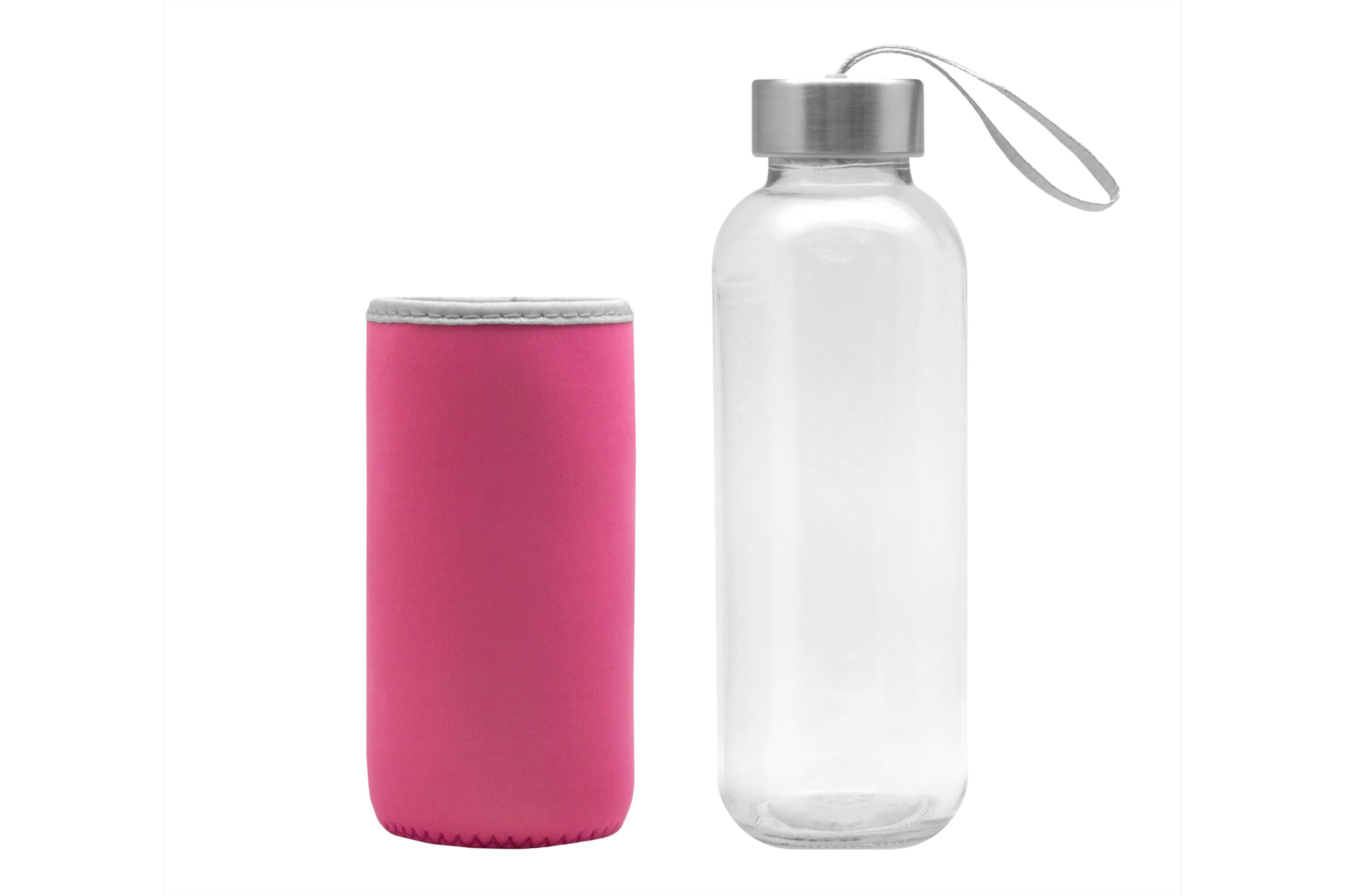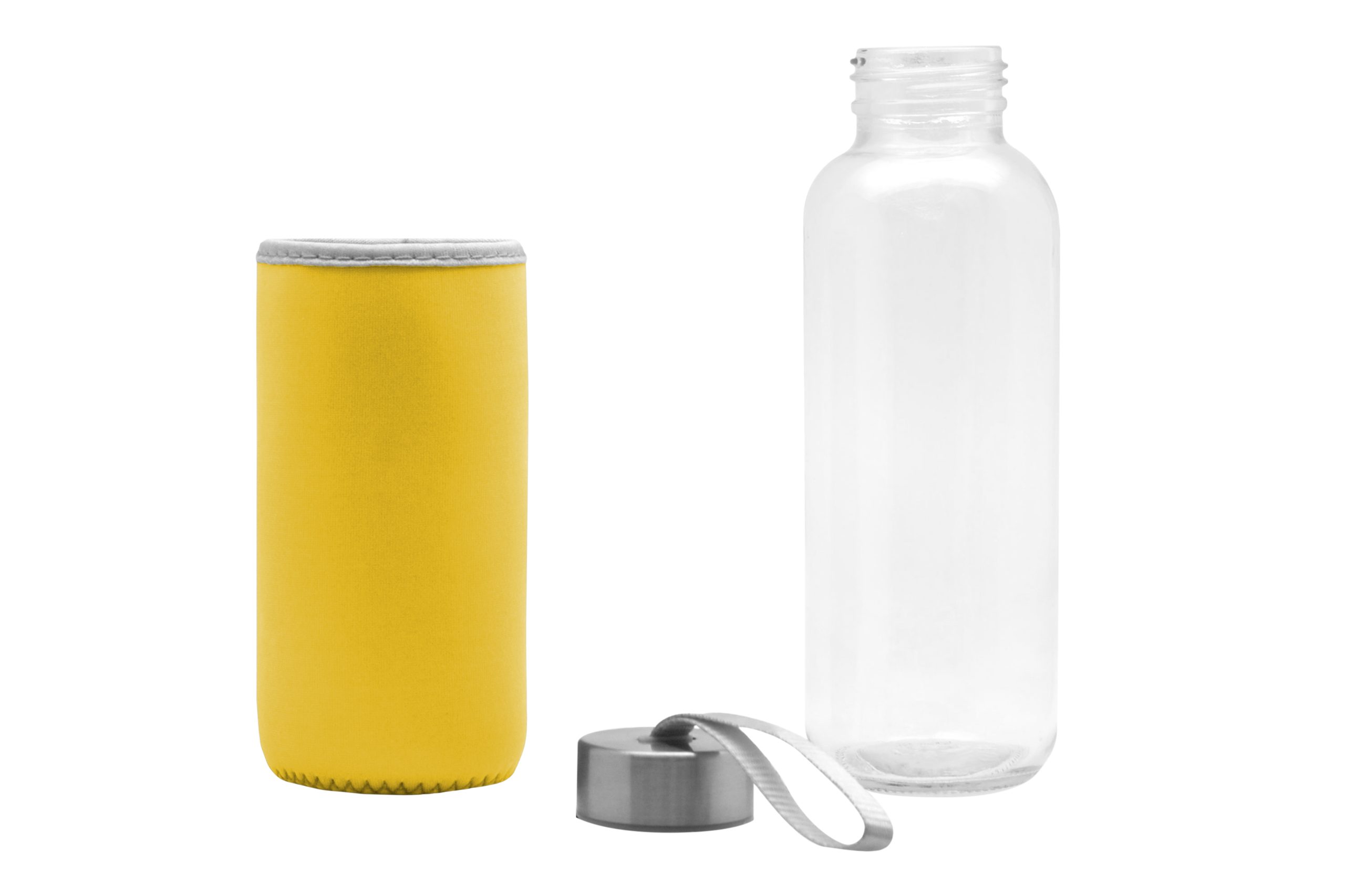 Ø 5,5 x 19,5 cm. Capacidad 440 ml. Vidrio. Cuerpo traslúcido. Funda de neopreno para proteger la botella y mantener la temperatura de las bebidas. Tapa de acero inoxidable con tira de tela. Botella apta para microondas y lavavajillas. Tapa y funda no pueden ser expuestos a estos electrodomésticos. Presentación en caja de regalo.