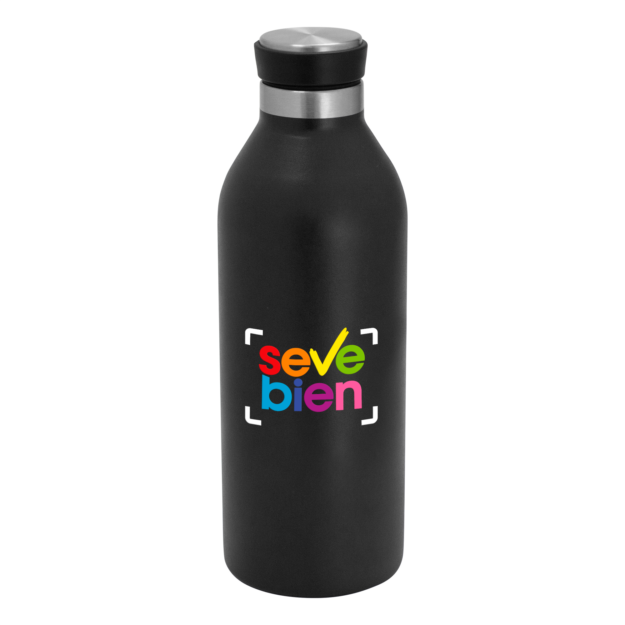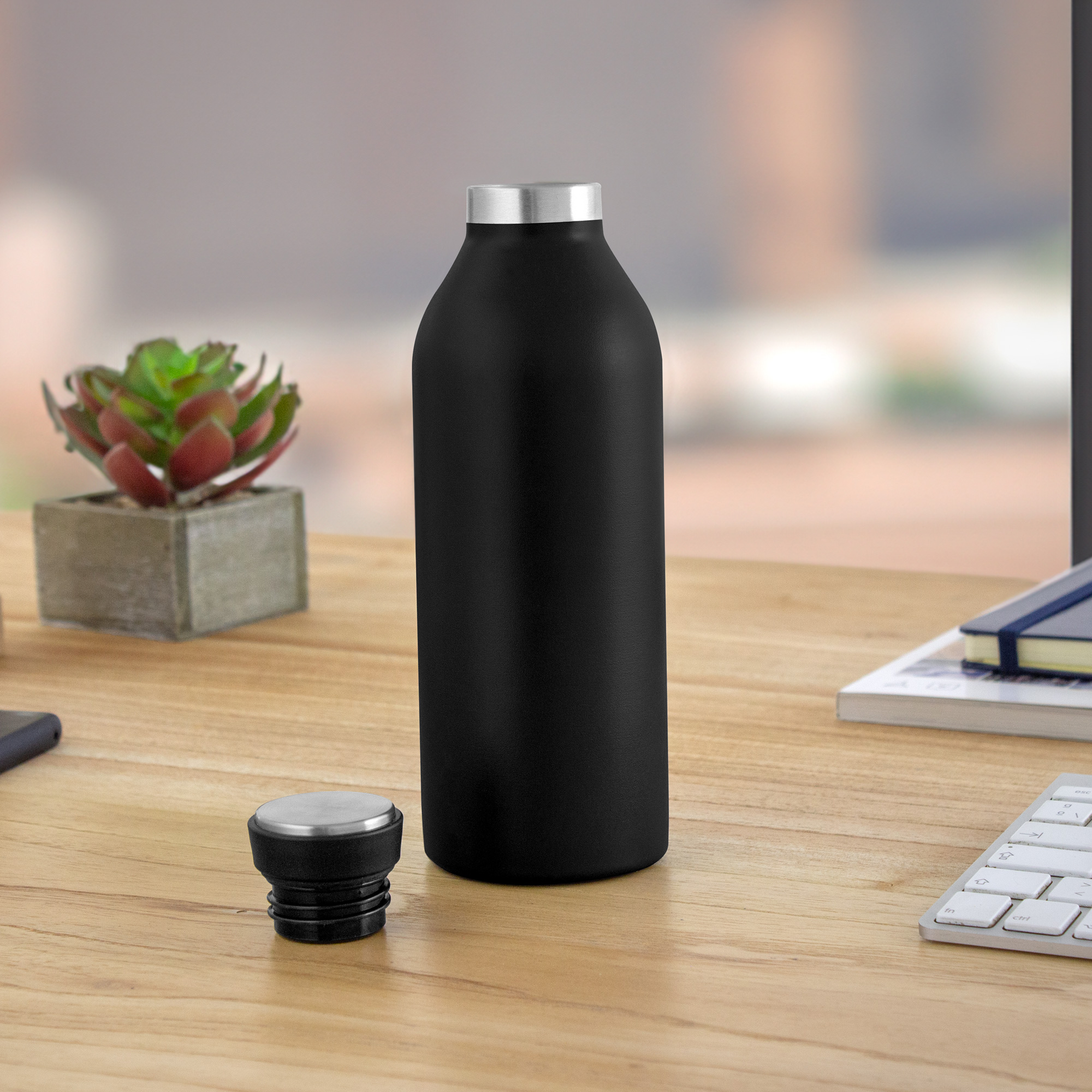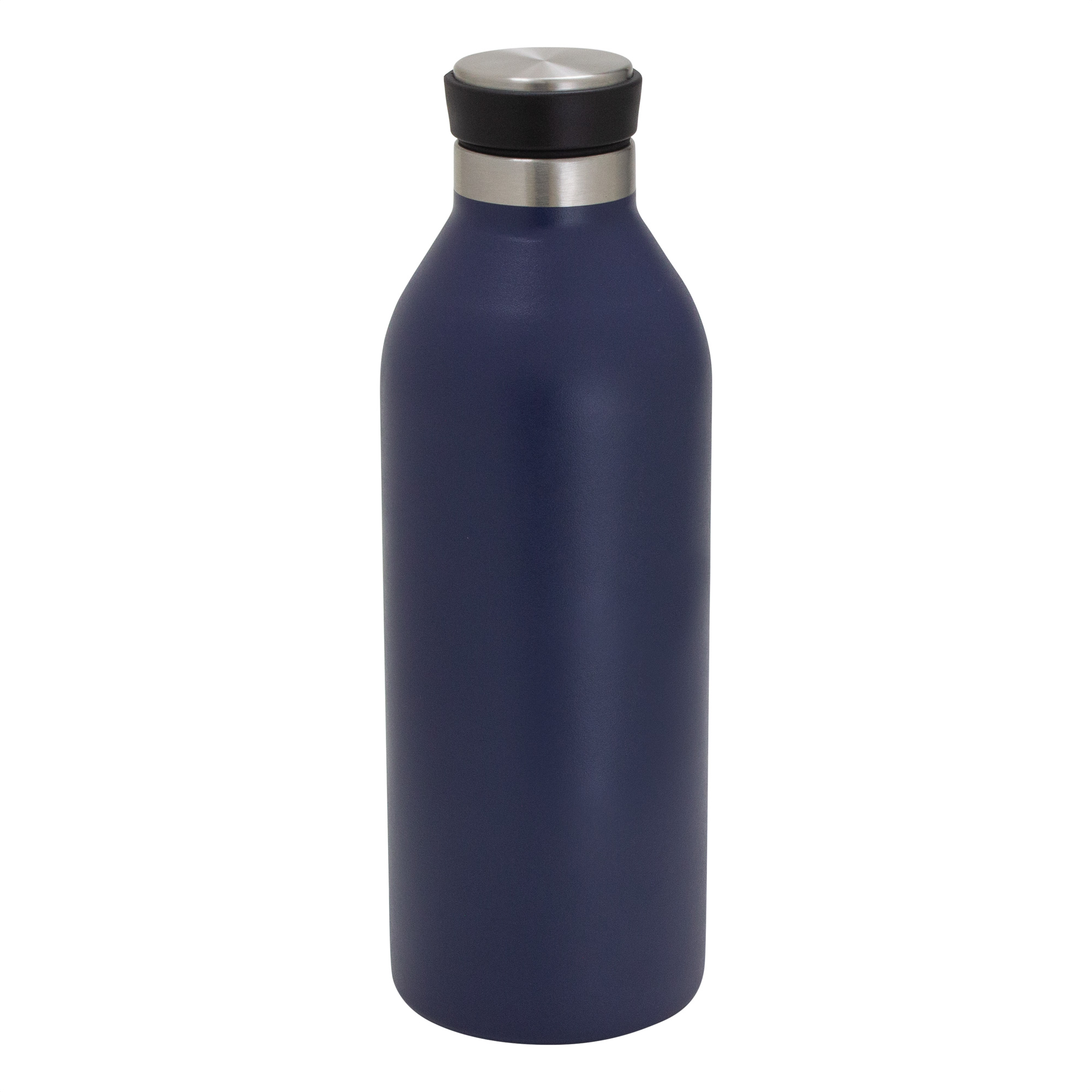 Ø 7,2 cm x 21,5 cm. Capacidad 500 ml. Acero inoxidable. Botella doble pared, sellada al vacío. Interior en acero 304 y exterior en acero 201. Pintura acabado mate. Tapa de polipropileno, acero inoxidable 201 y anillo de silicona. Mantiene por más de 12 hs la temperatura de las bebidas calientes y 24 hs de las bebidas frías. Presentación en caja de regalo kraft.