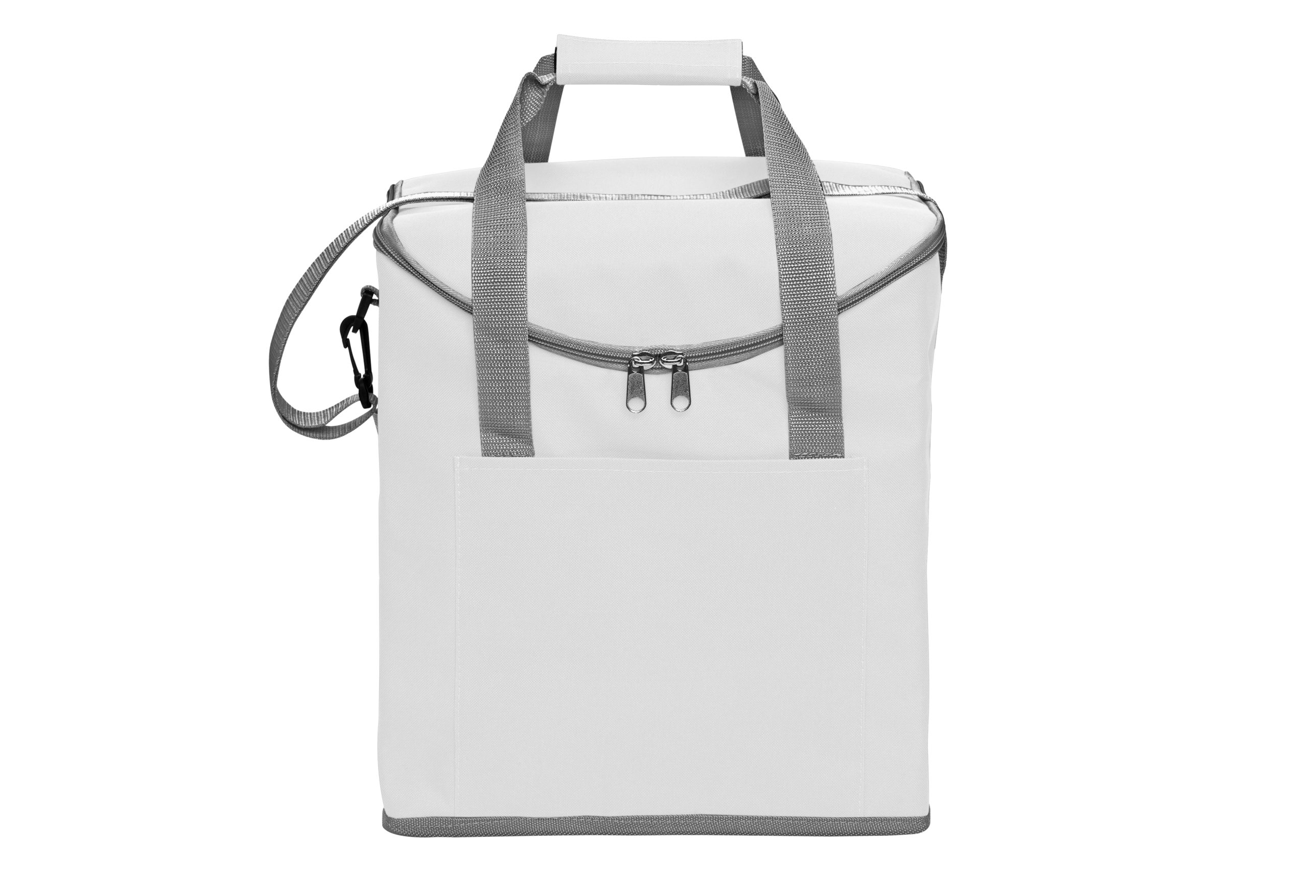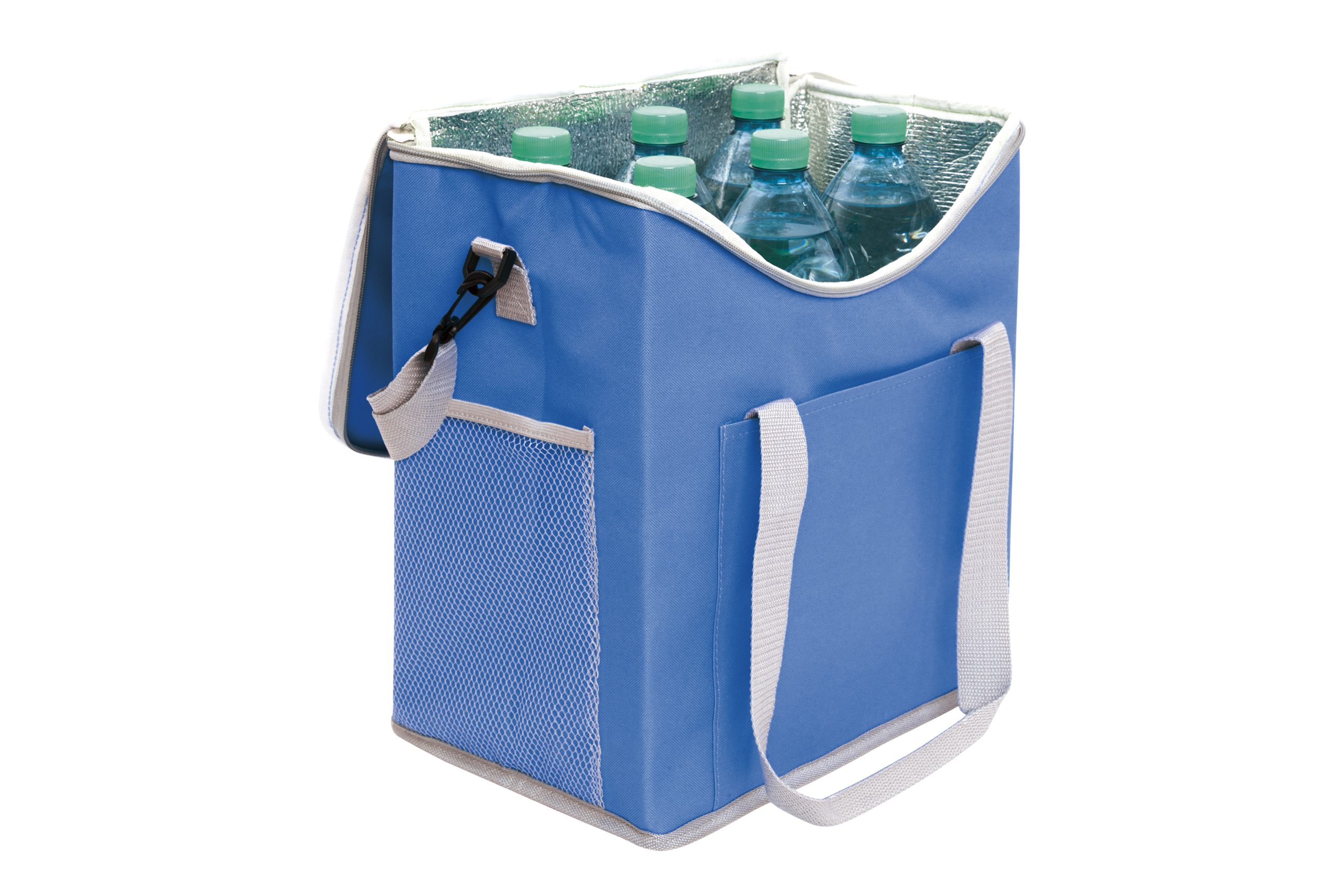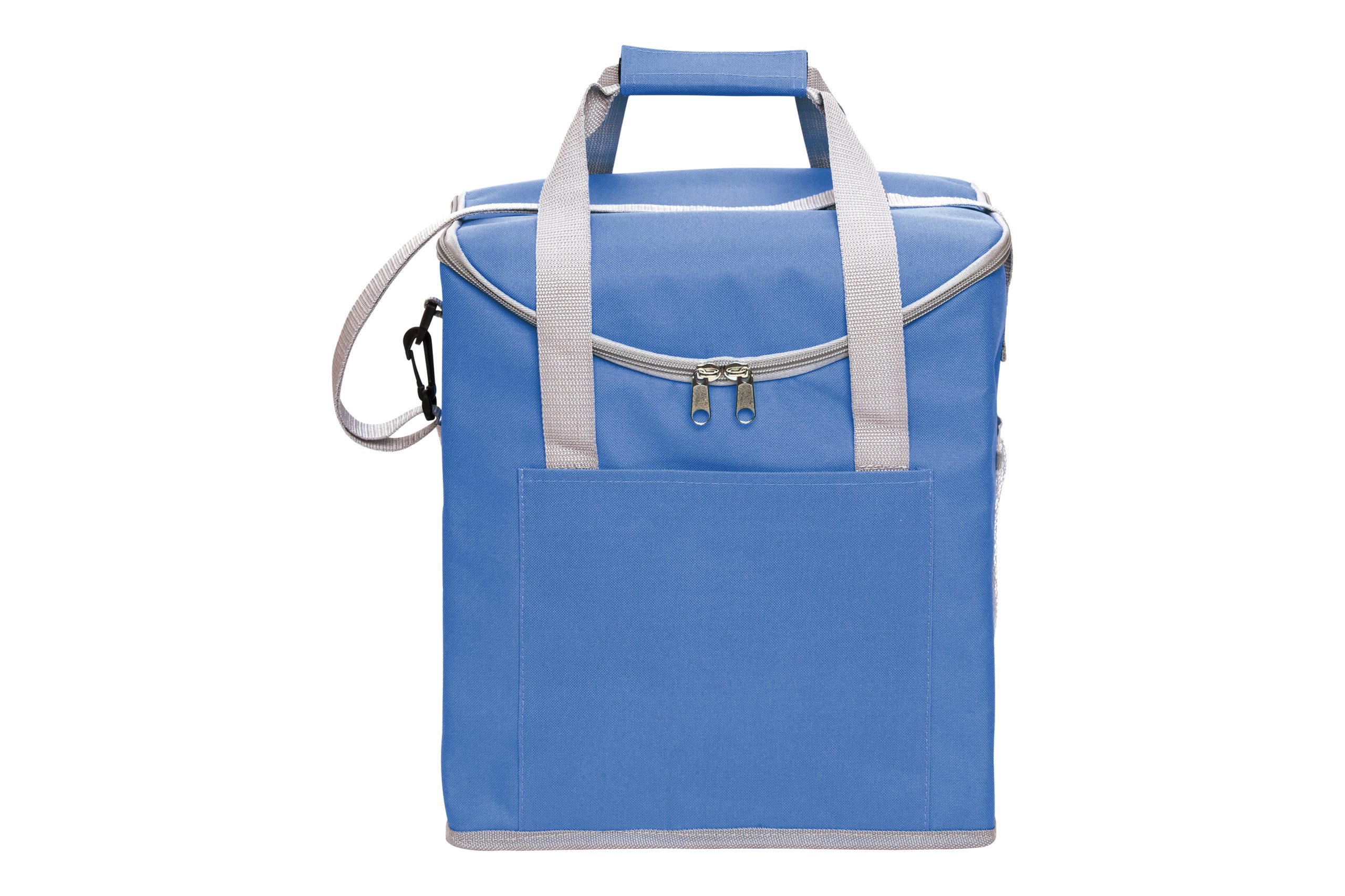 30 x 34 x 19,5 cm. Capacidad 37 litros. Poliéster. 600D Lonchera térmica con recubrimiento interior metalizado. Un bolsillo frontal y dos bolsillos laterales de red. Correa tipo bandolera y dos manijas reforzadas con cierre de velcro. Capacidad hasta 6 botellas de 2,5 litros