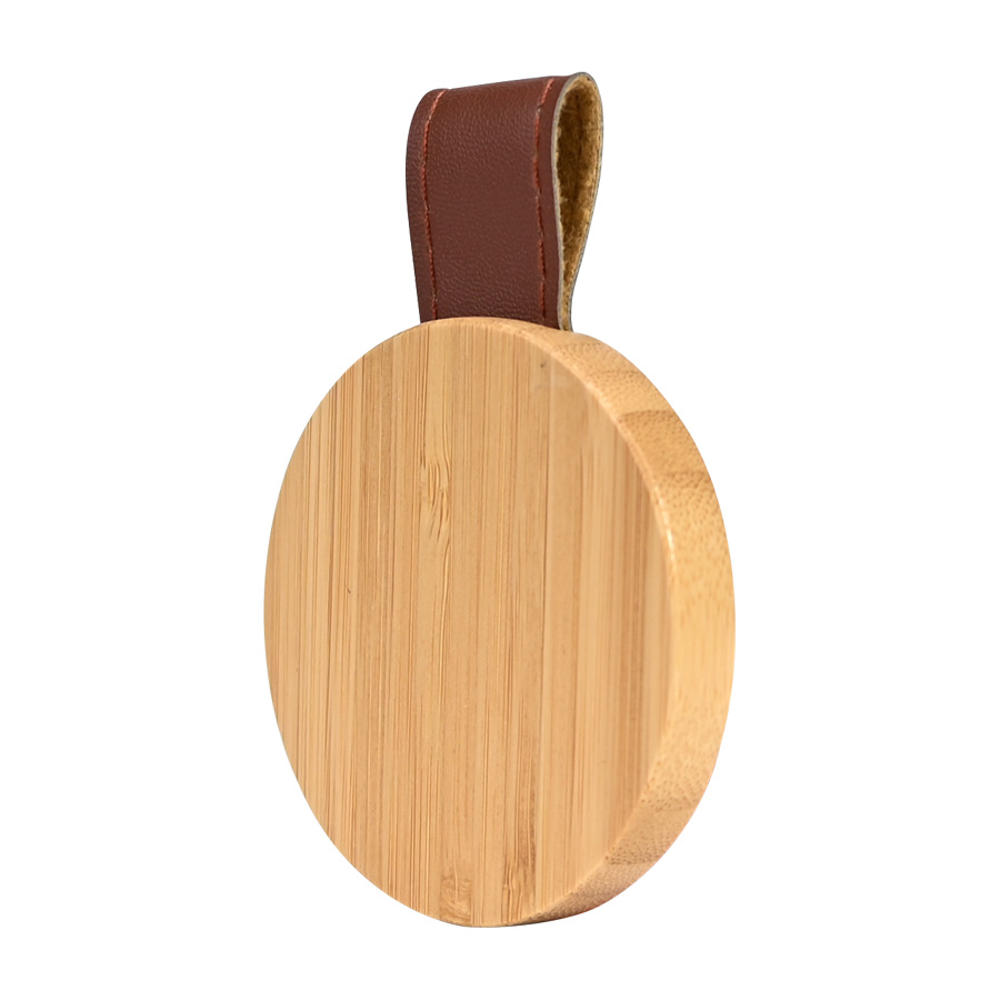 Espejo redondo con cuerpo de madera de Bamboo y correa de Eco-Cuero café.