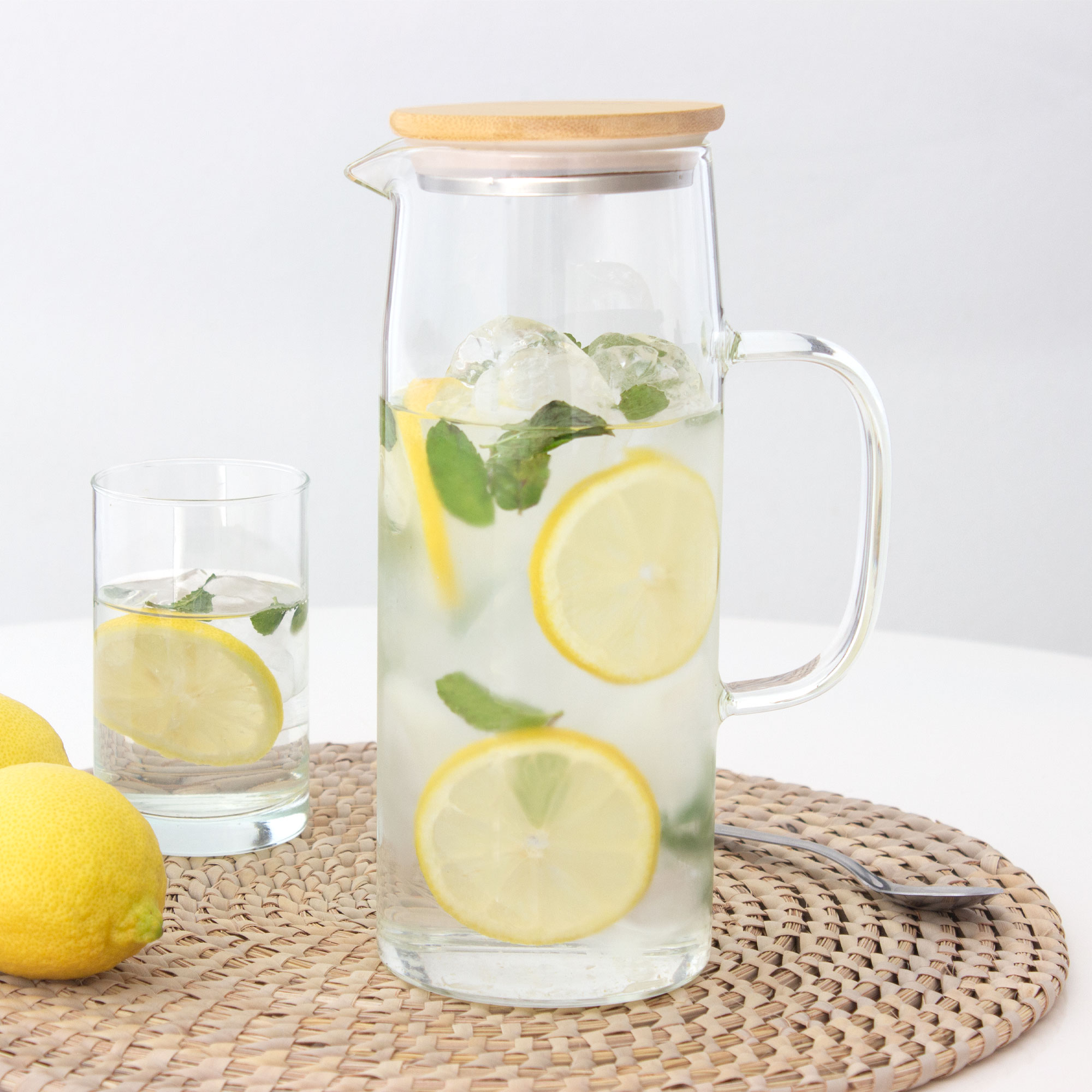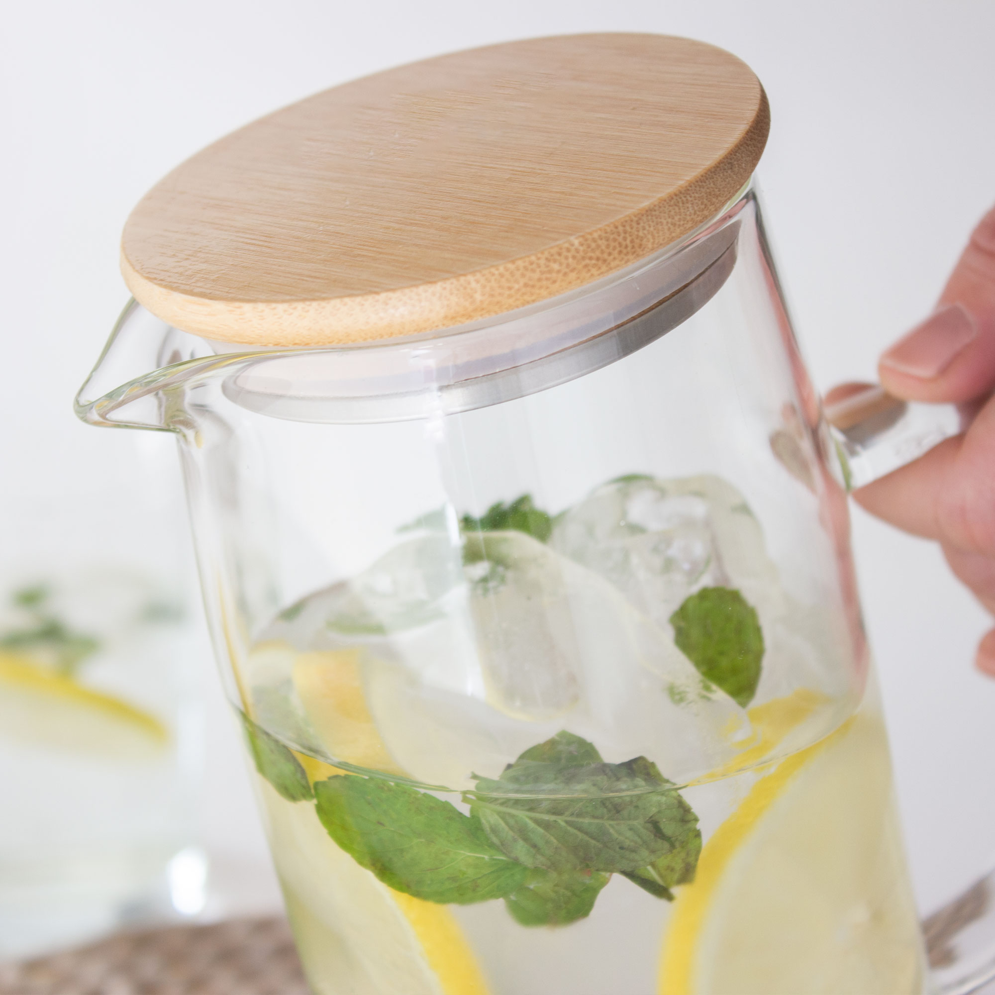 Ø 8,8 x 22,8 cm. Capacidad 1100 ml. Vidrio de borosilicato y bambú. Jarra con pico vertedor y asa de vidrio de borosilicato. Tapa de bambú y acero inoxidable 304 con anillo de silicona antiderrame. Presentación en caja de regalo kraft.