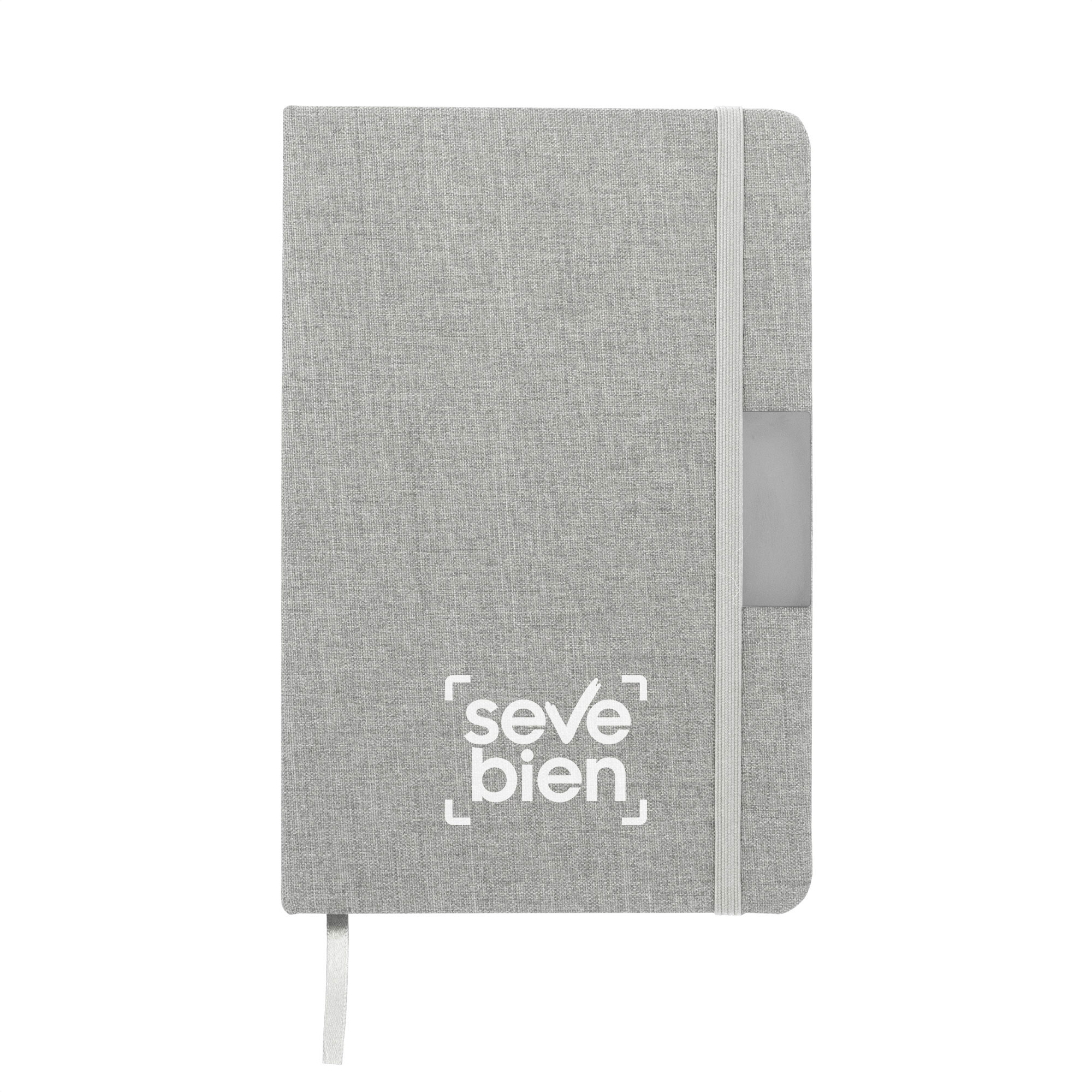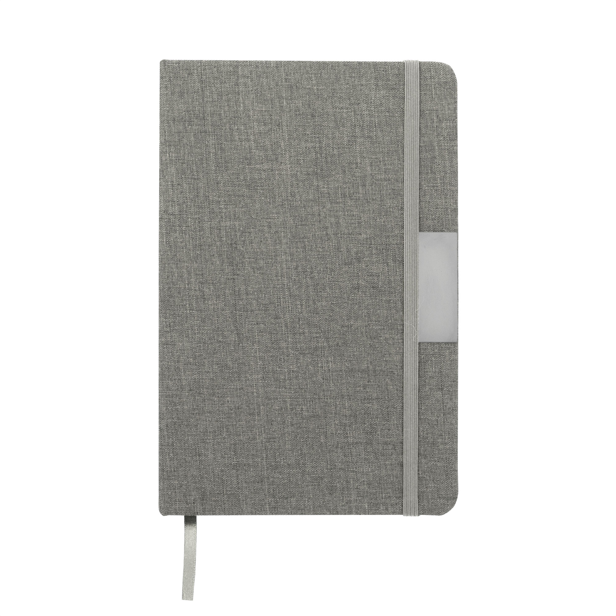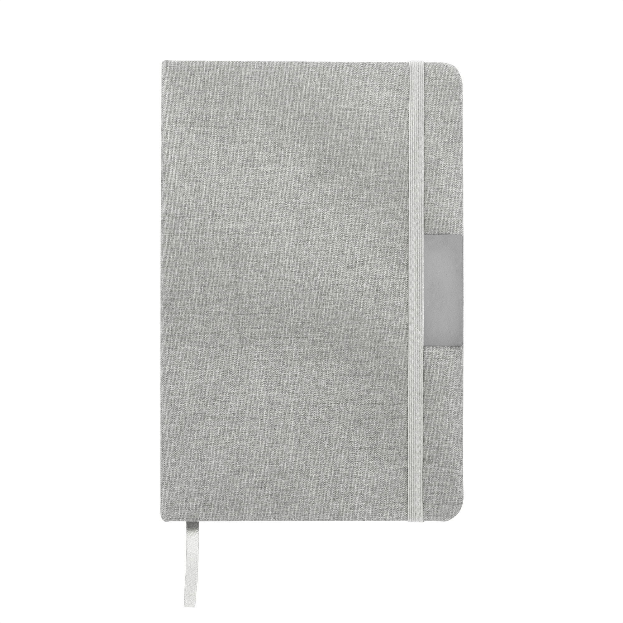 Sostenibilidad elegante.Libreta con placa metálica. Tapa de cartón de 300g recubierta en RPET 310. Placa metálica de 5 x 2 cm. Interior de 80 hojas rayadas en papel obra de 70g. Encuadernación cosida. Cierre con banda elástica del mismo color de la tapa.Medidas: 14 x 21 x 1,5 cm.