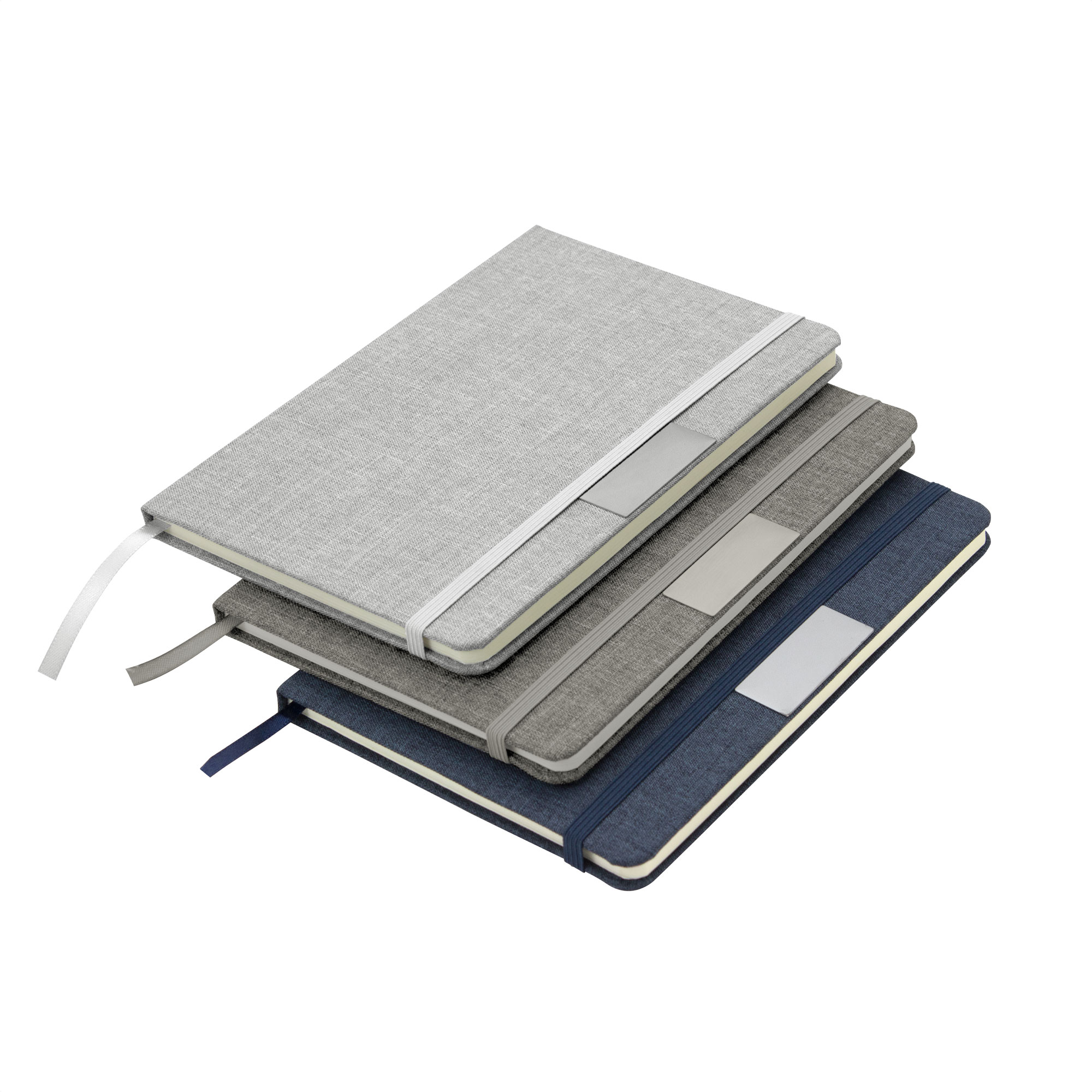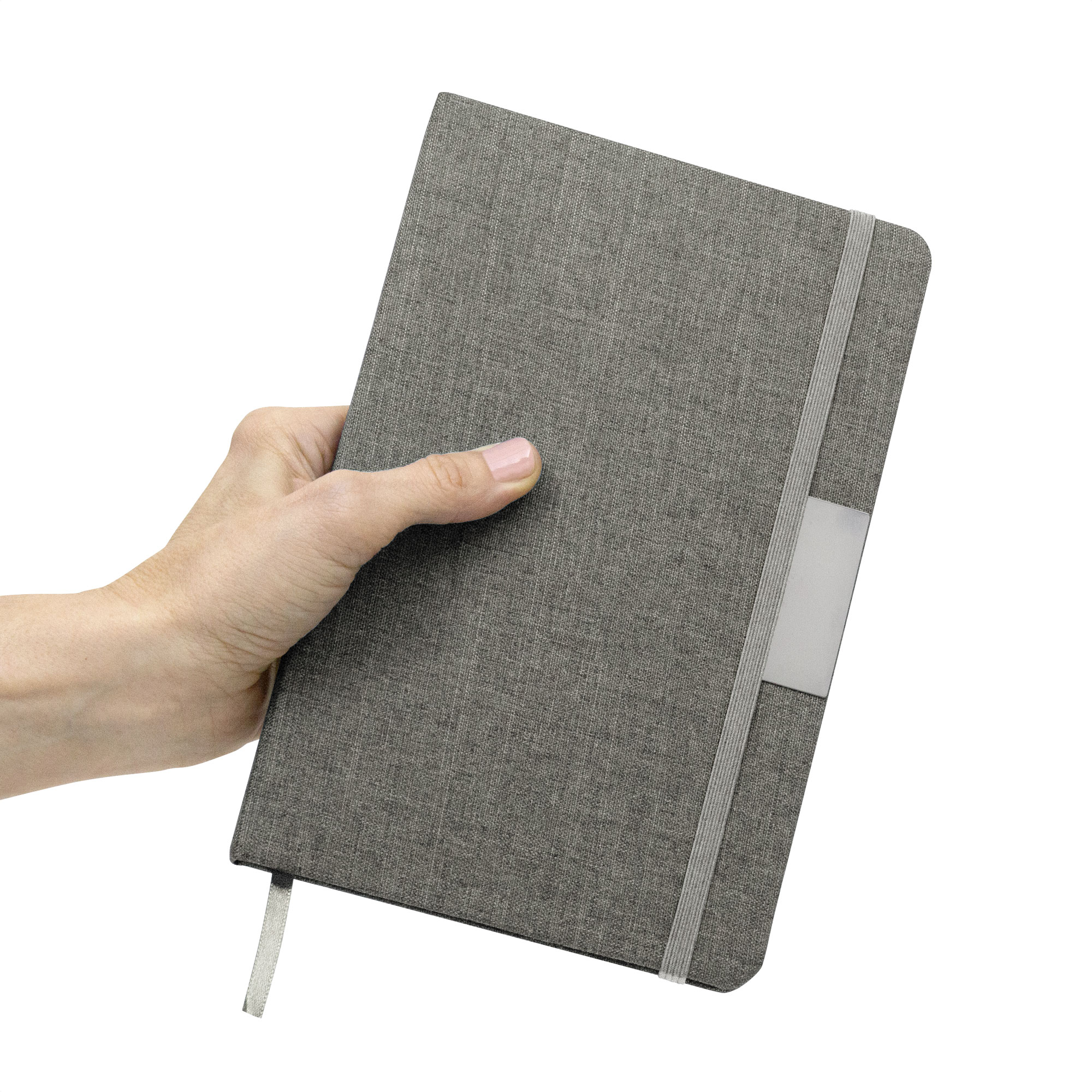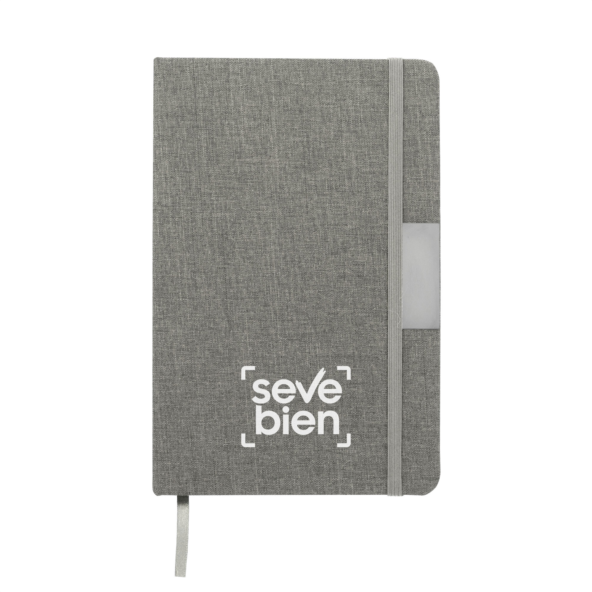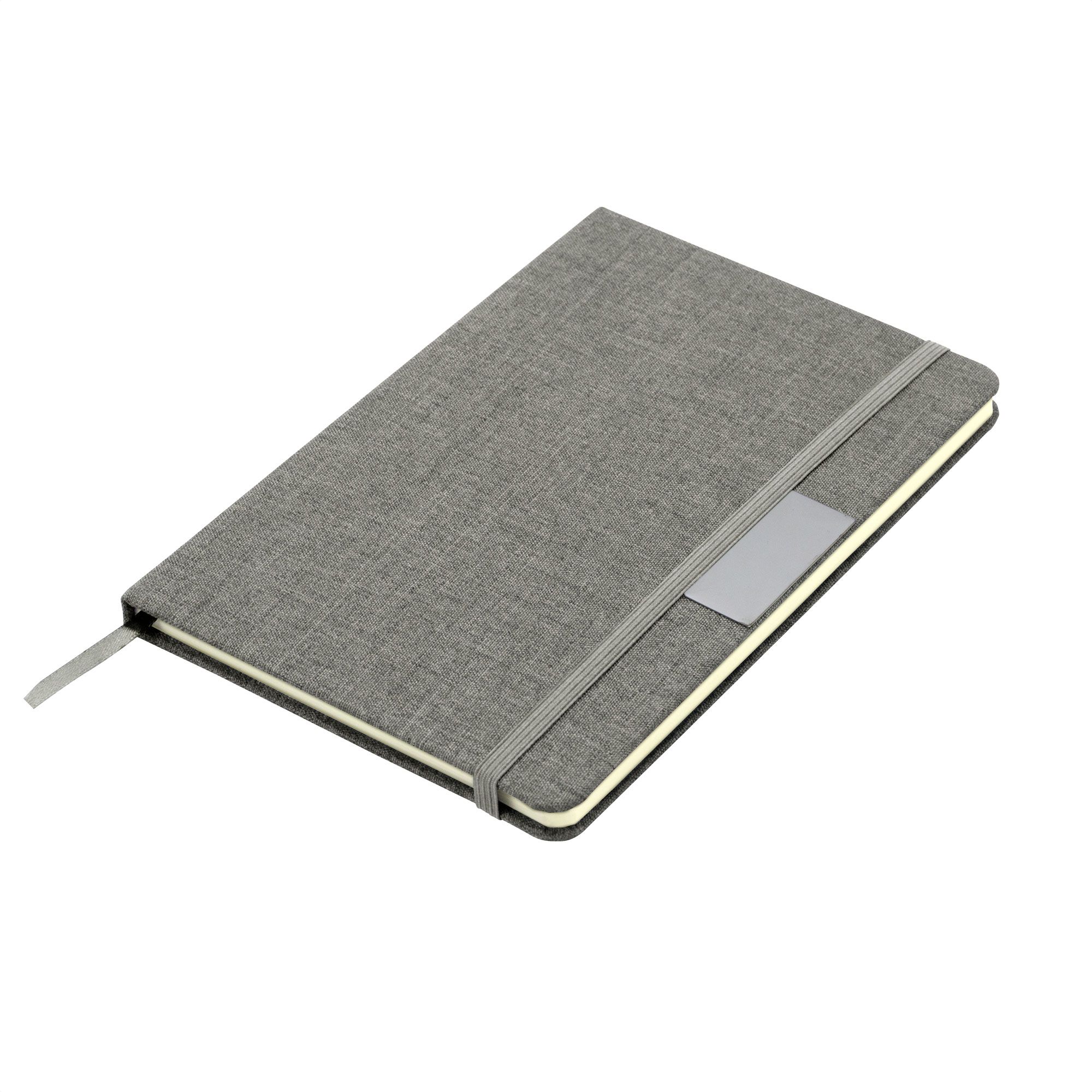 Sostenibilidad elegante.Libreta con placa metálica. Tapa de cartón de 300g recubierta en RPET 310. Placa metálica de 5 x 2 cm. Interior de 80 hojas rayadas en papel obra de 70g. Encuadernación cosida. Cierre con banda elástica del mismo color de la tapa.Medidas: 14 x 21 x 1,5 cm.