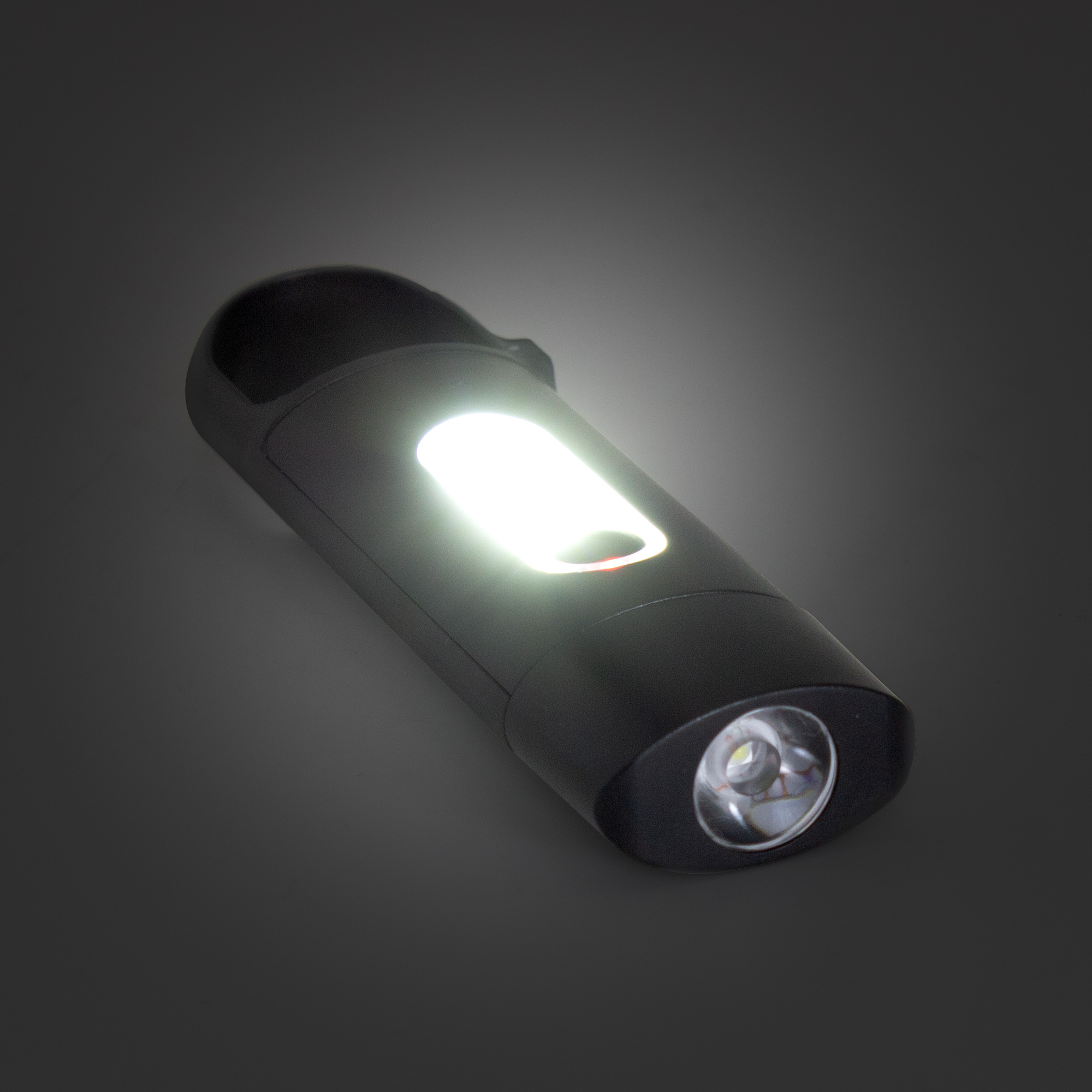 Perfecta para llevar en tu mochila.Linterna portátil recargable. Con mosquetón incorporado. Luz de emergencia y 3 intensidades de iluminación (alta, baja e intermitente). Batería recargable de 200 mAh. Puerto USB-C y cable de carga de 30 cm de largo color negro. Medidas: 11 x 3 x 1,5 cm.