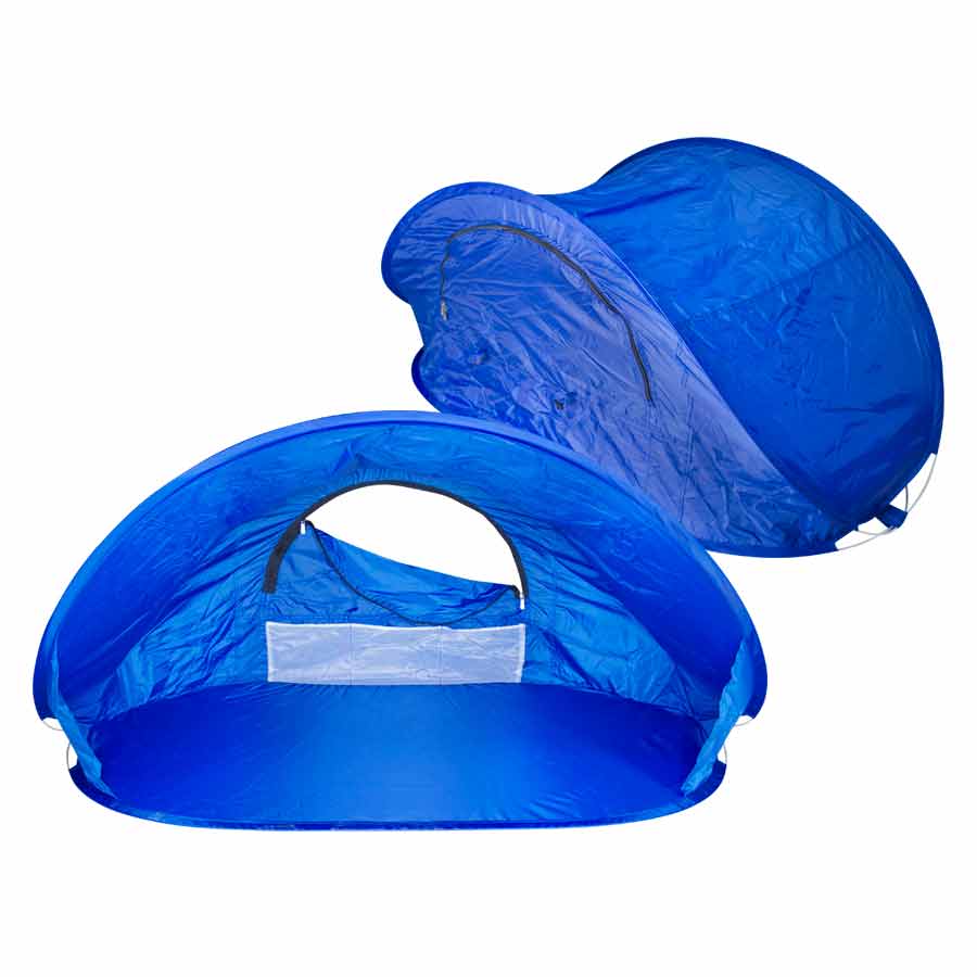 Mini Carpa plegable de Playa. Material 100% poliéster, con bolsillos interiores, ventana de ventilación y funda para guardar. Contiene varas de 3mm de espesor y un juego de 2 estacas para la arena en bolsita de poliéster. Muy práctica para proteger cabeza y niños pequeños de la exposición prolongada al sol. Fácil de armar y desarmar.