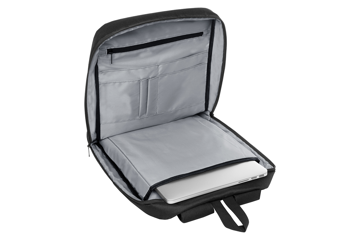 32 x 45 x 7 cm. Capacidad 10 litros. Poliéster 300D (gris) y Poliéster 600D (negro). Mochila portanotebook hasta 15′. Dos bolsillos frontales con cierre. Compartimento principal con cierre de amplia apertura. Bolsillo porta laptop y bolsillos organizadores de accesorios. Correas ajustables y espalda acolchada con red. Bolsillo de seguridad con cierre en la espalda. Tiradores de cierres metálicos.