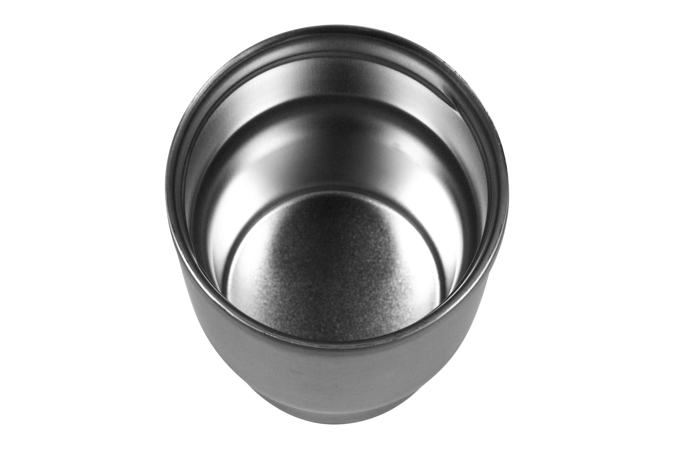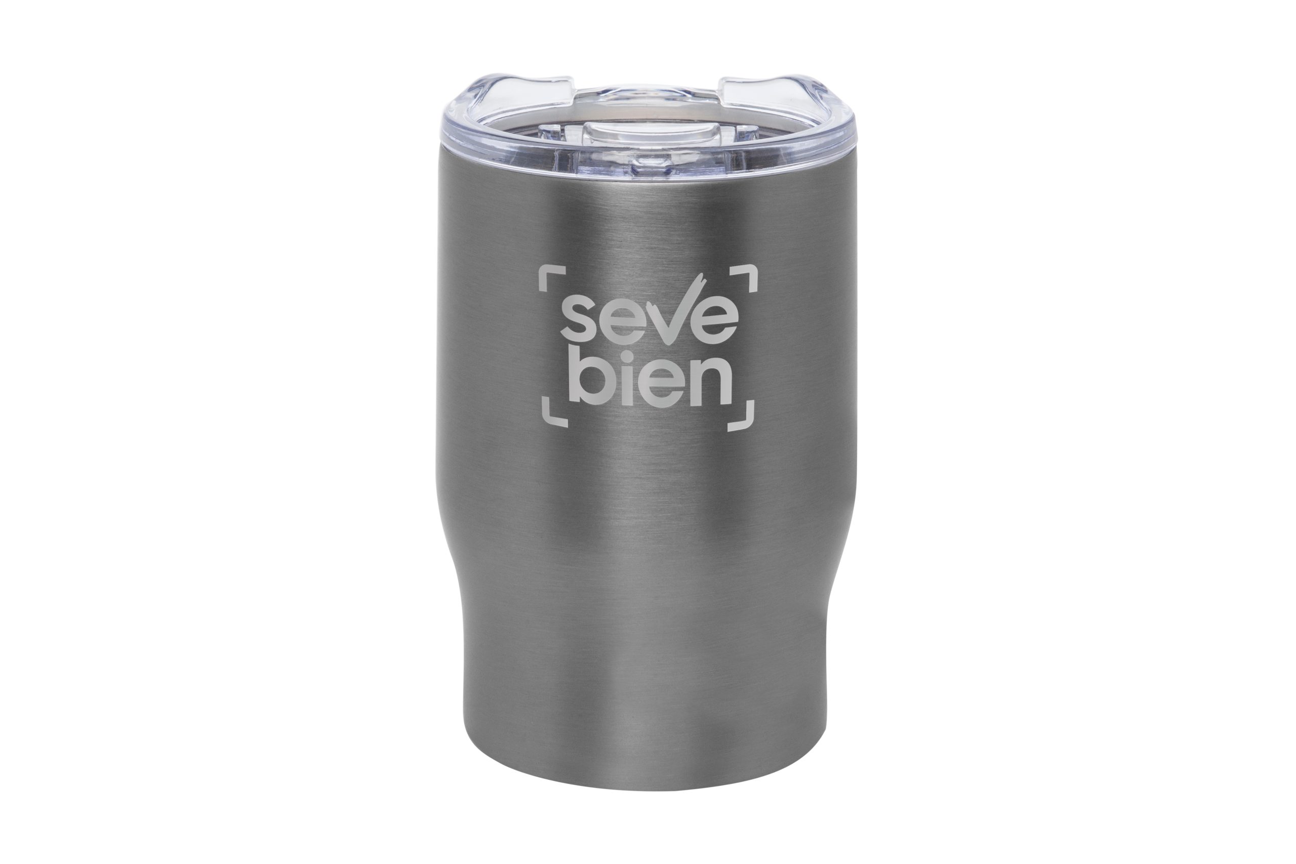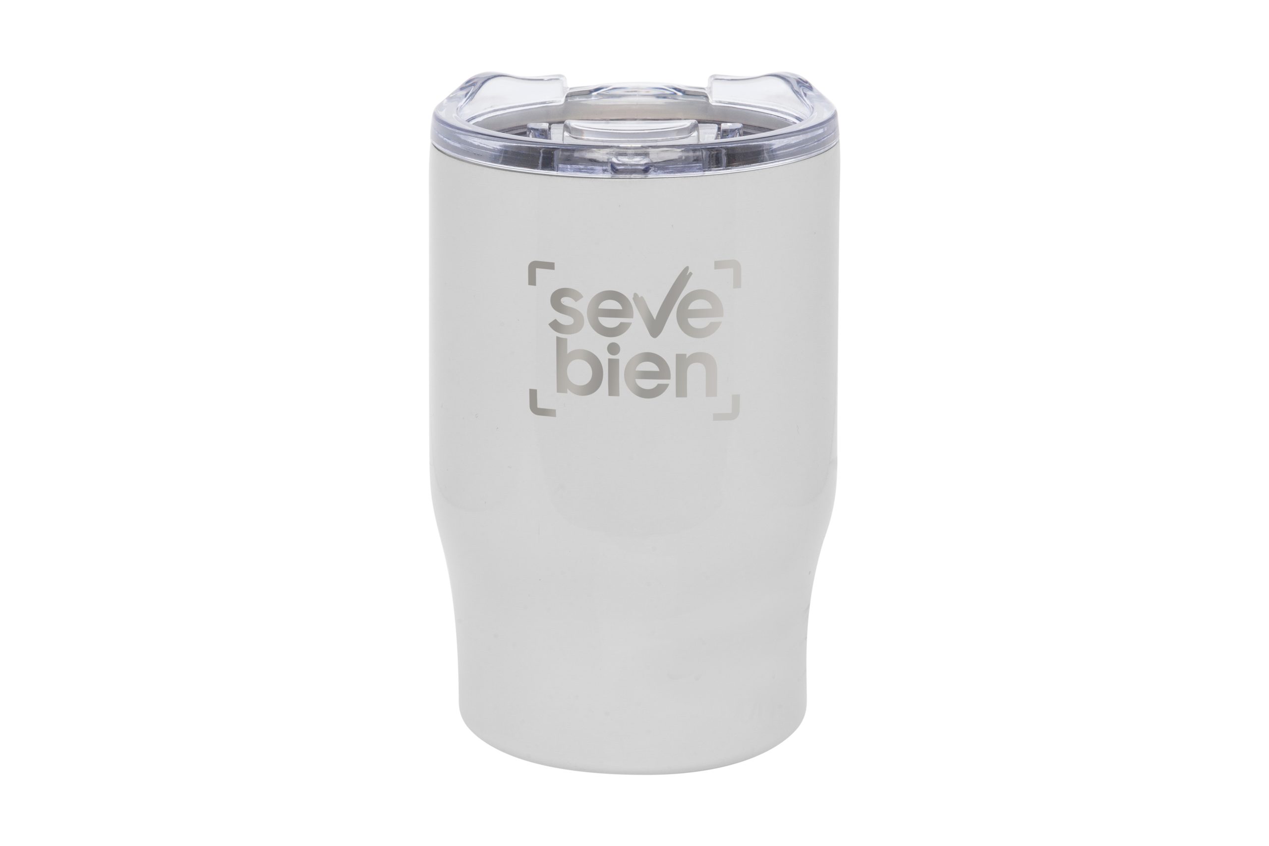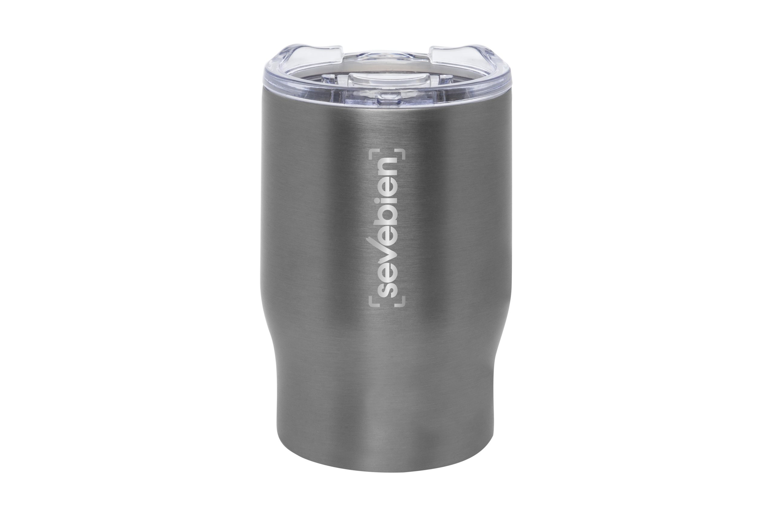 Ø 8,5 x 13,3 cm. Capacidad 350 ml. Acero inoxidable. Mug doble pared. Interior de acero 304 y exterior de acero 201. Tapa plástica transparente a presión con anillo de silicona. Mantienen las bebidas frías y calientes por más tiempo. No utilizar con bebidas gaseosas. Presentación en caja de regalo.