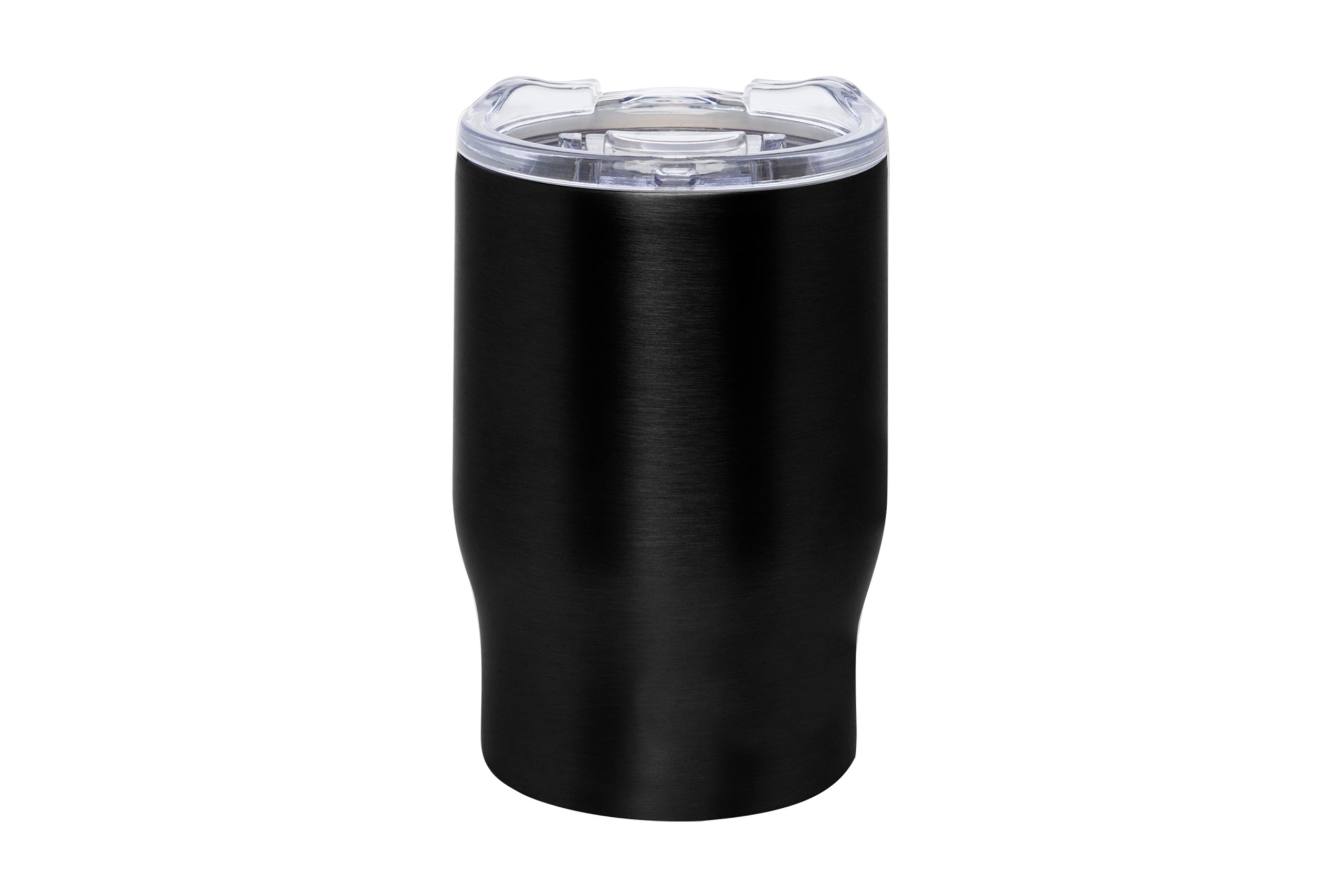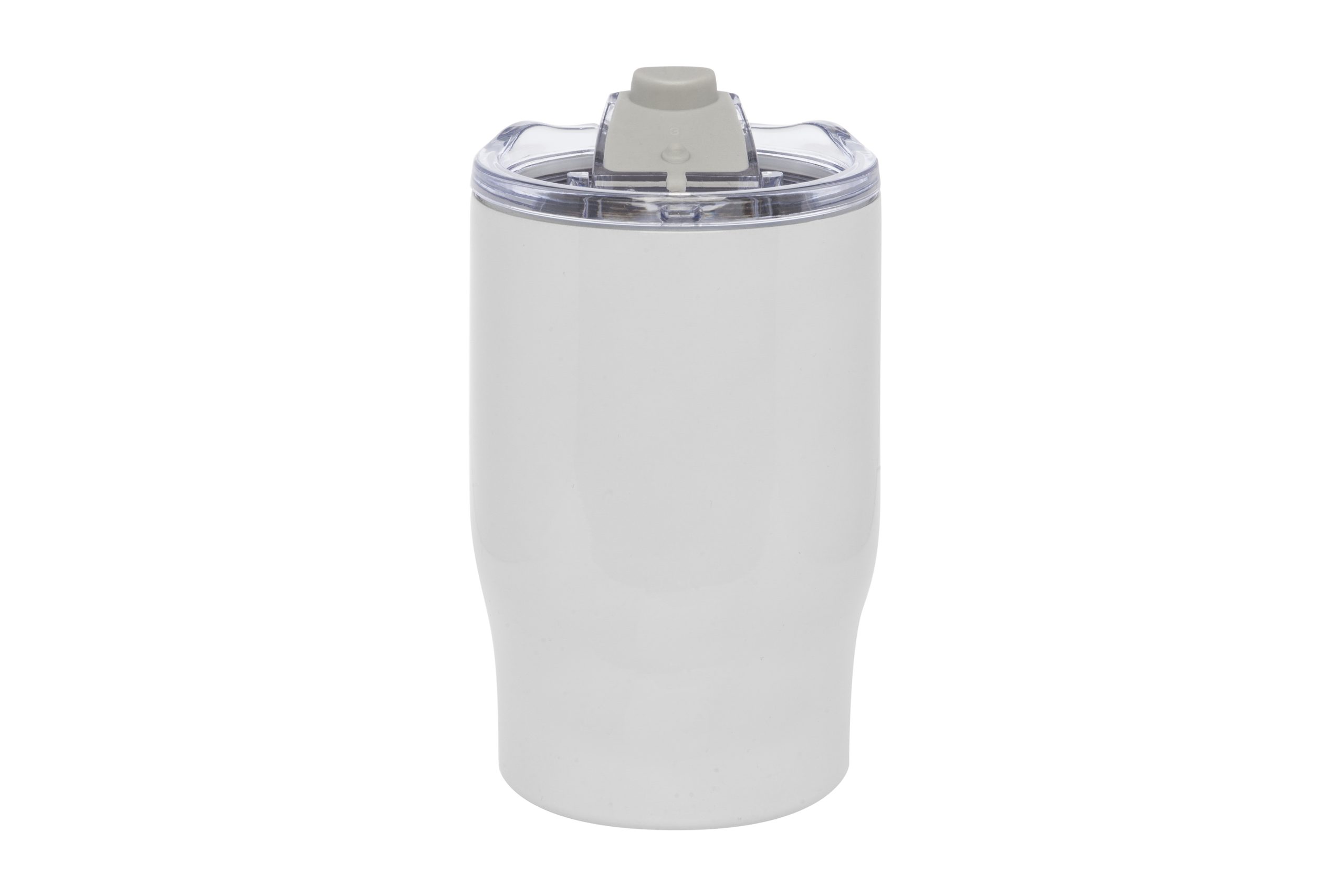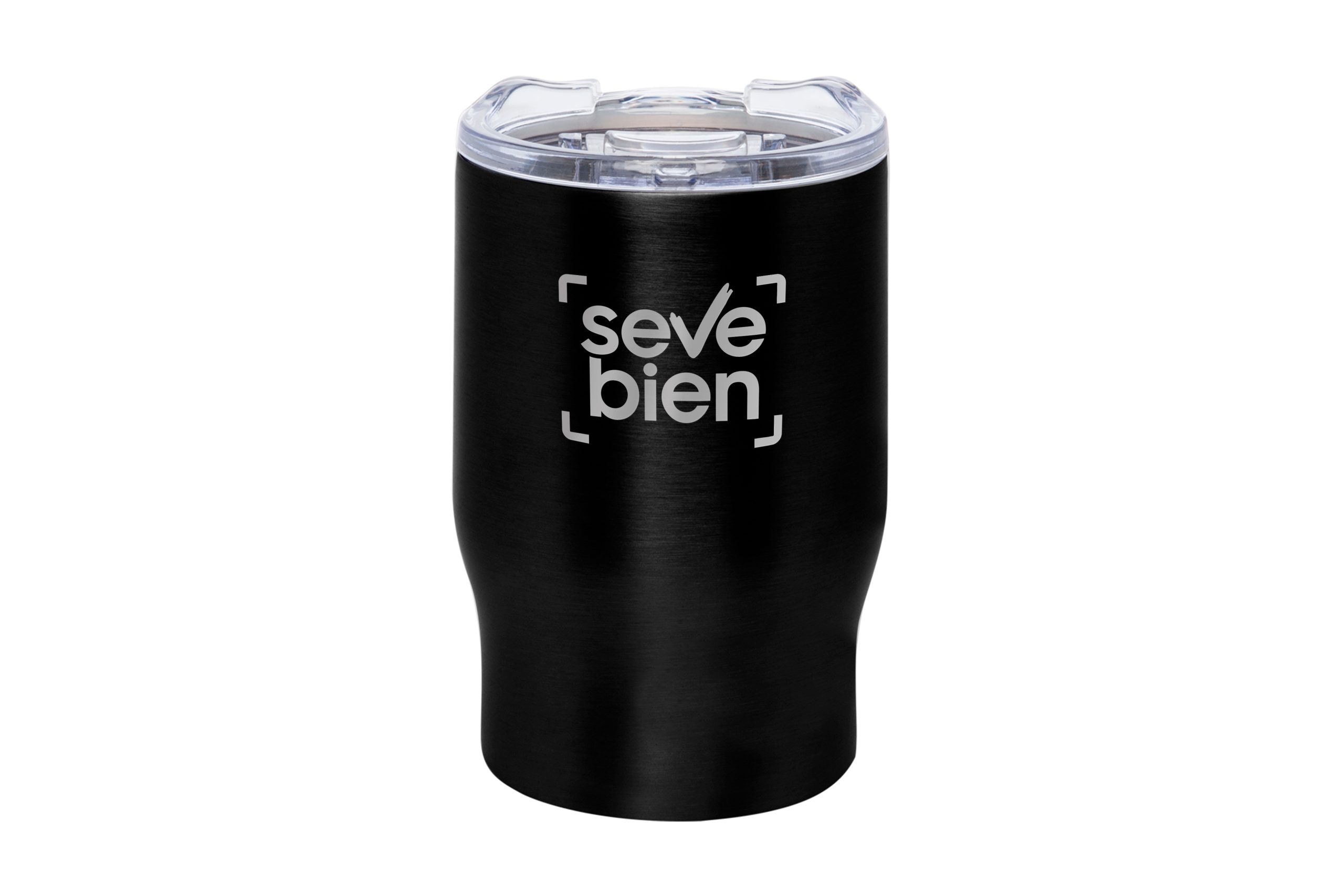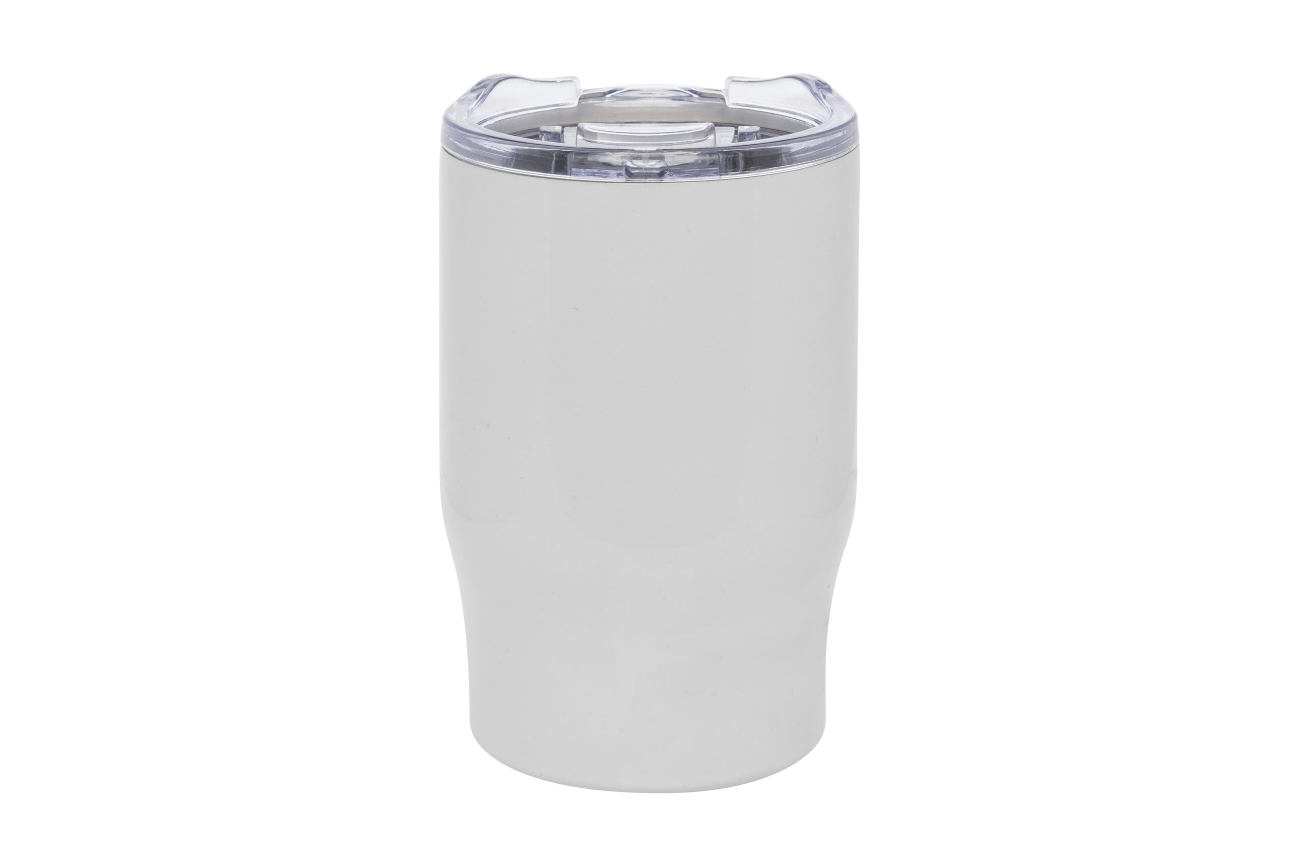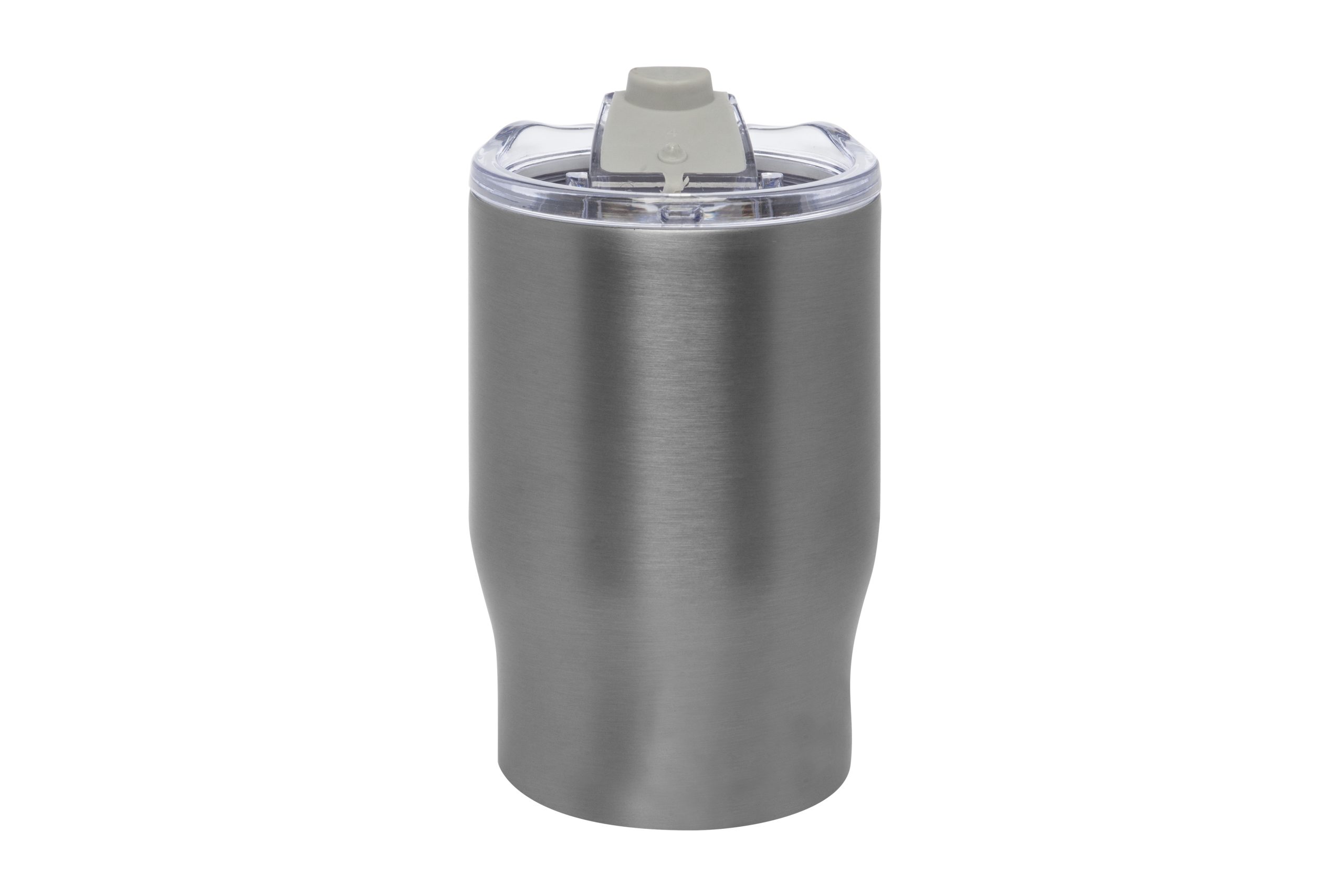 Ø 8,5 x 13,3 cm. Capacidad 350 ml. Acero inoxidable. Mug doble pared. Interior de acero 304 y exterior de acero 201. Tapa plástica transparente a presión con anillo de silicona. Mantienen las bebidas frías y calientes por más tiempo. No utilizar con bebidas gaseosas. Presentación en caja de regalo.