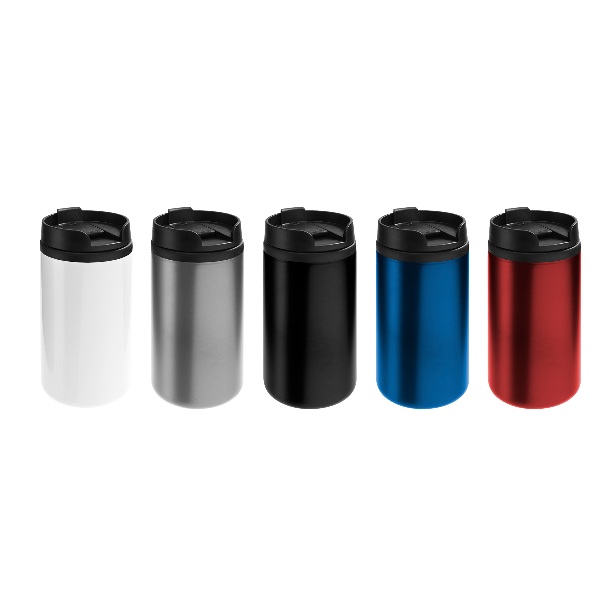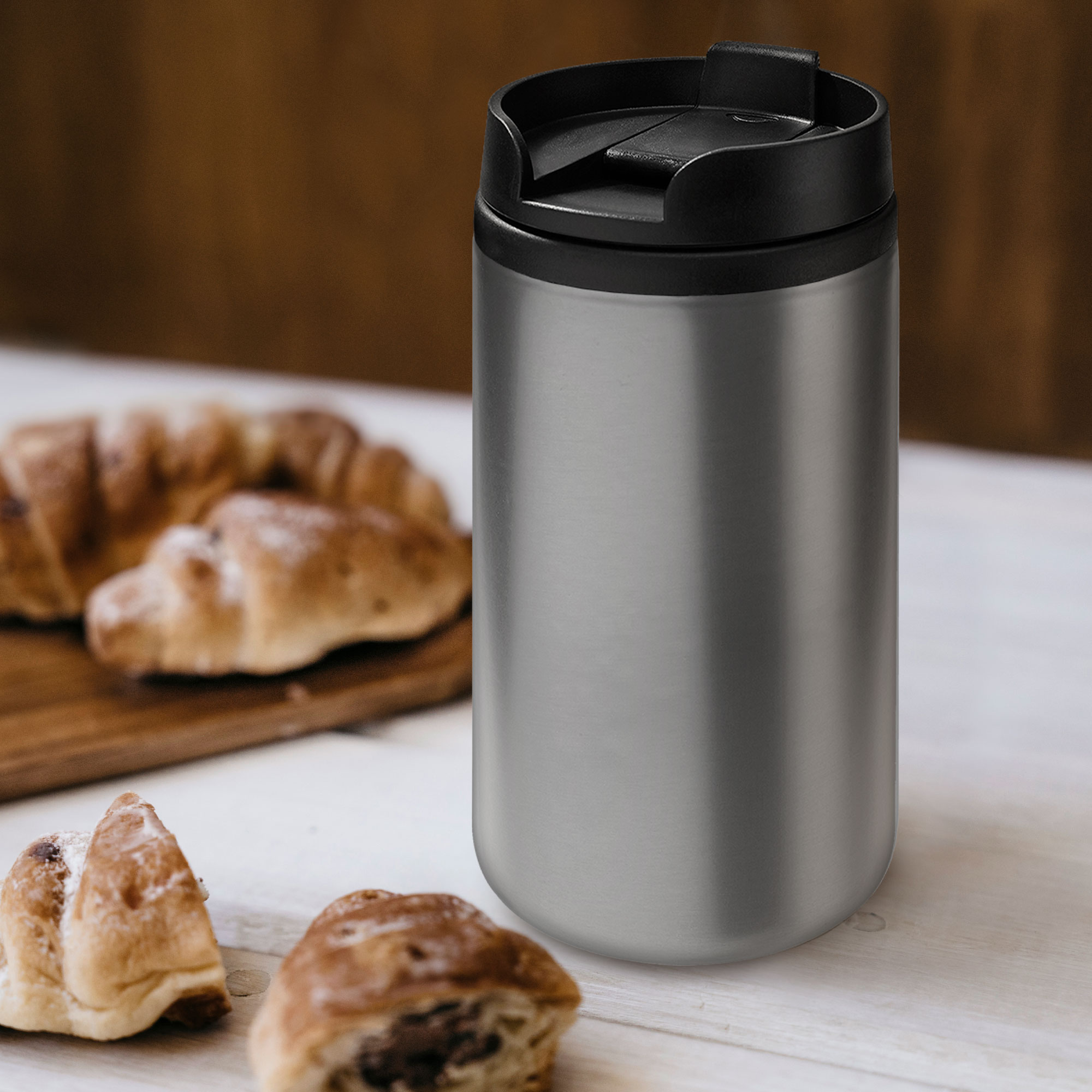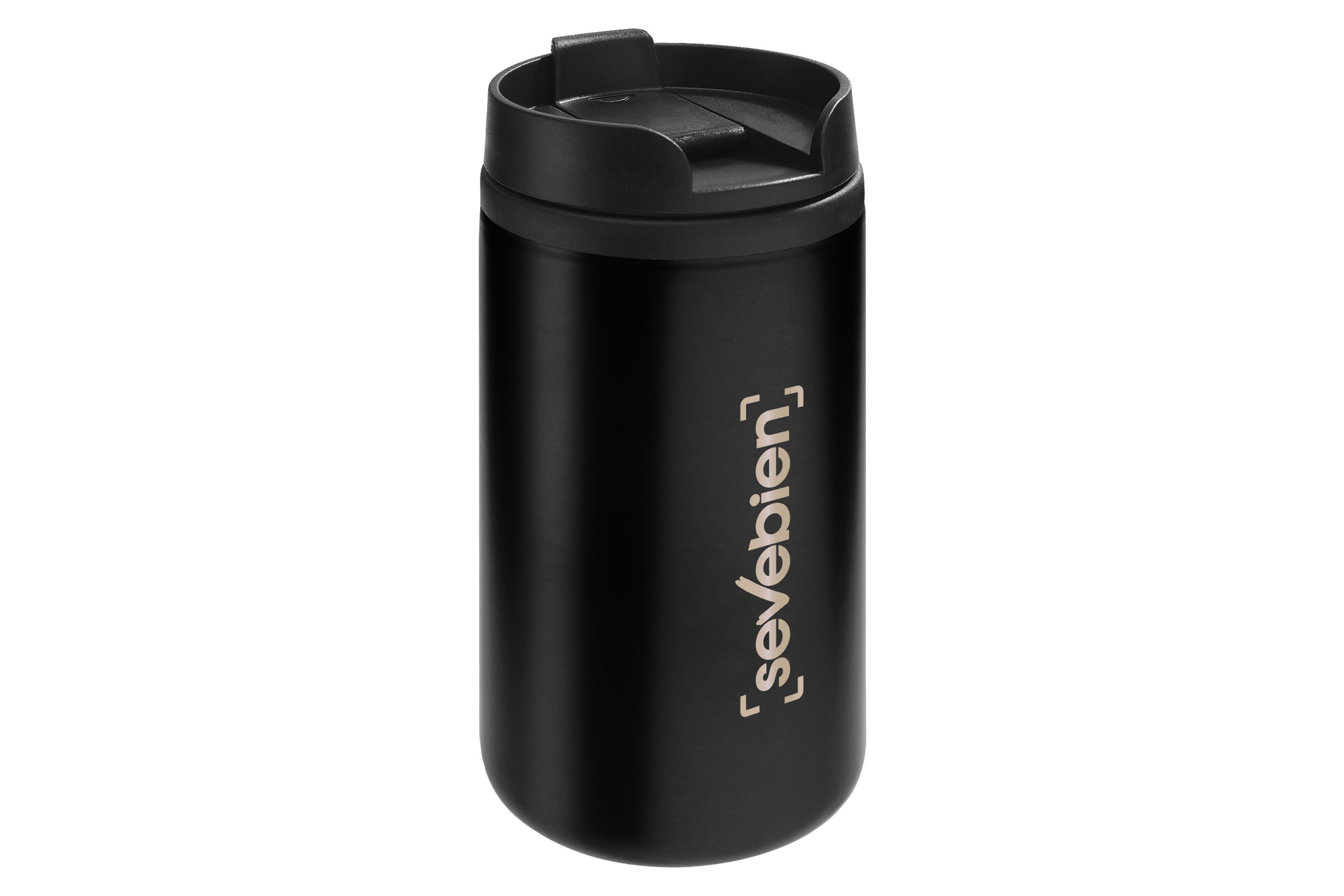 Ø 7 x 14 cm. Capacidad 290 ml. Acero inoxidable y plástico. Mug doble pared, interior de plástico y exterior de acero inoxidable. Tapa a rosca plástica color negro con cierre a presión antiderrame. Base antideslizante. Presentación en caja de regalo.