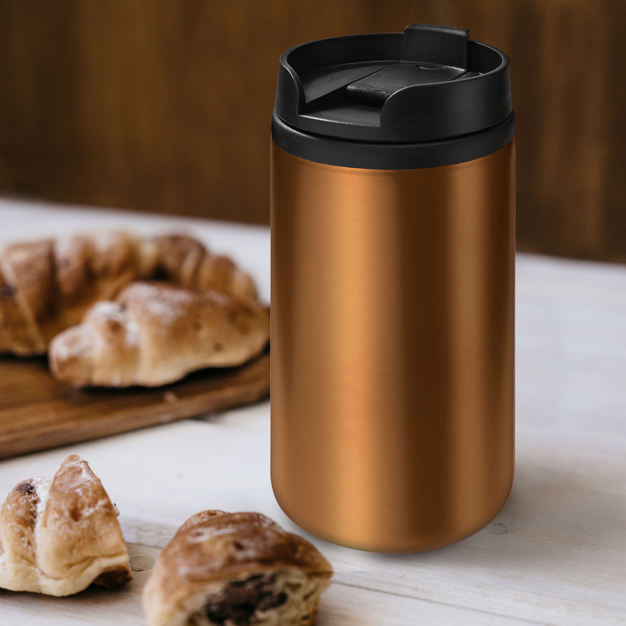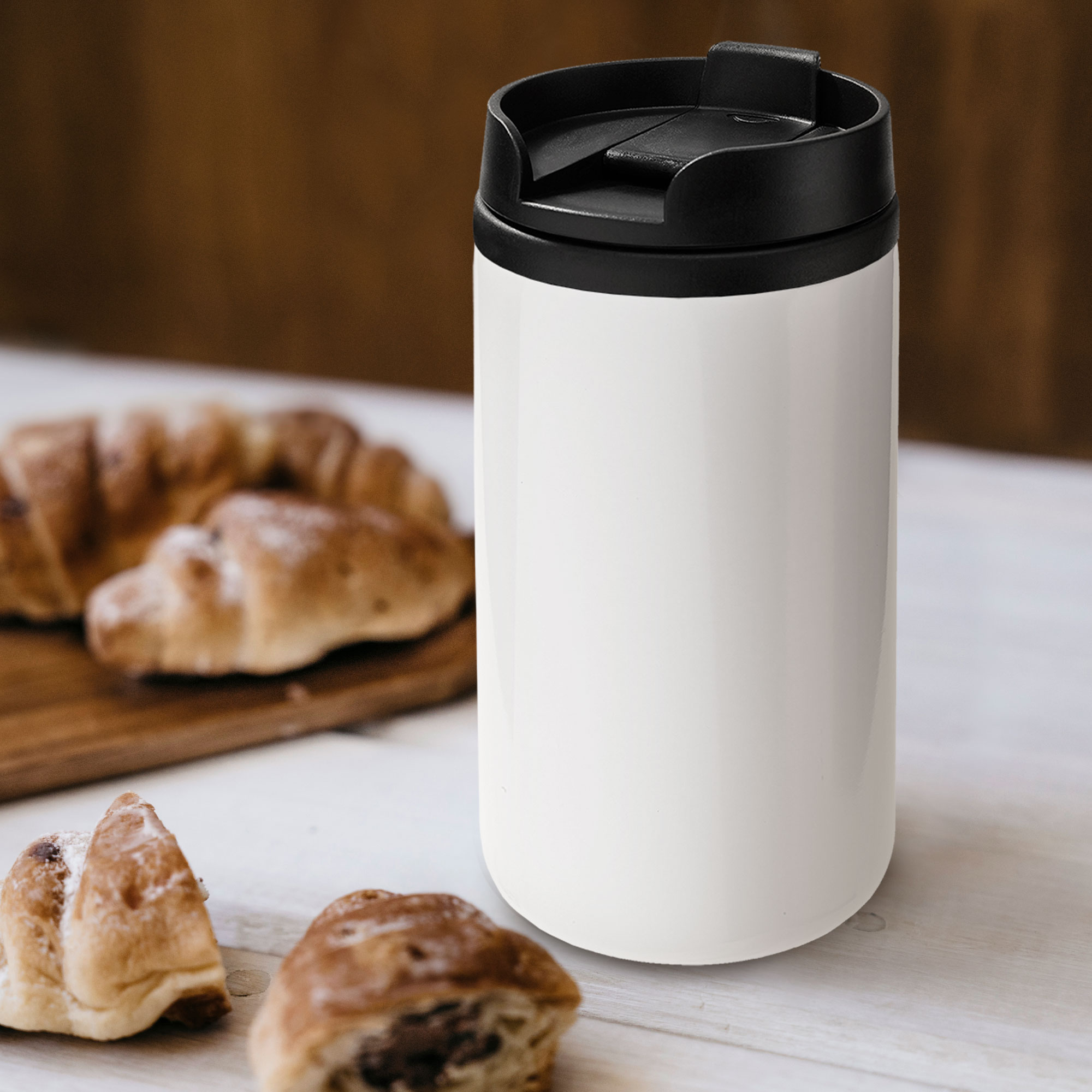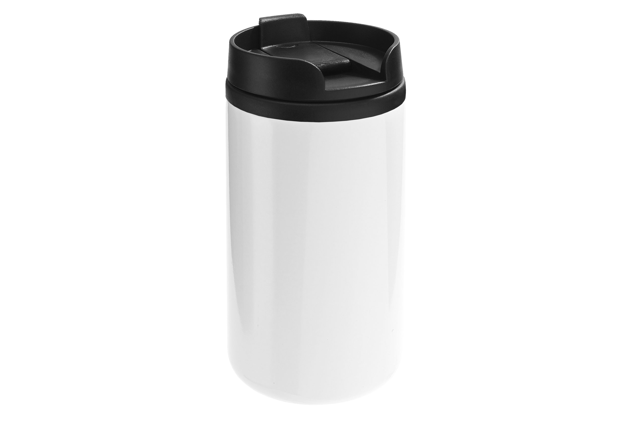 Ø 7 x 14 cm. Capacidad 290 ml. Acero inoxidable y plástico. Mug doble pared, interior de plástico y exterior de acero inoxidable. Tapa a rosca plástica color negro con cierre a presión antiderrame. Base antideslizante. Presentación en caja de regalo.