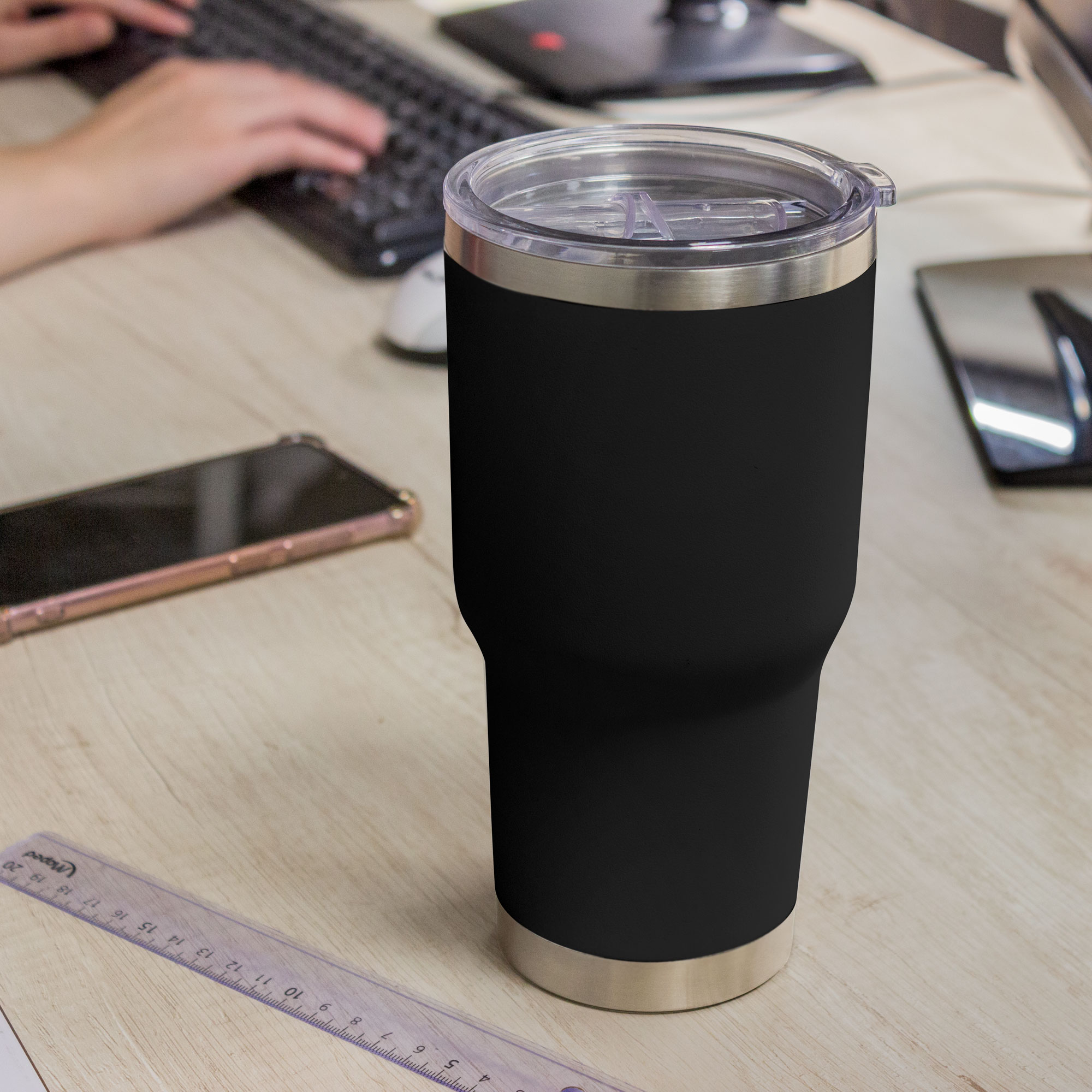 Ø 10 x 20 cm. Capacidad 850 ml. Acero Inoxidable. Mug doble pared sellado al vacío. Tecnología Vacuum. Interior en acero 304 y exterior en acero 201. Pintura Powder Coat (pintura mas duradera y resistente a la corrosión y el paso del tiempo). Tapa plástica transparente a presión con anillo de silicona.. Mantiene las bebidas frías o calientes por más tiempo. Presentación en caja de regalo.
