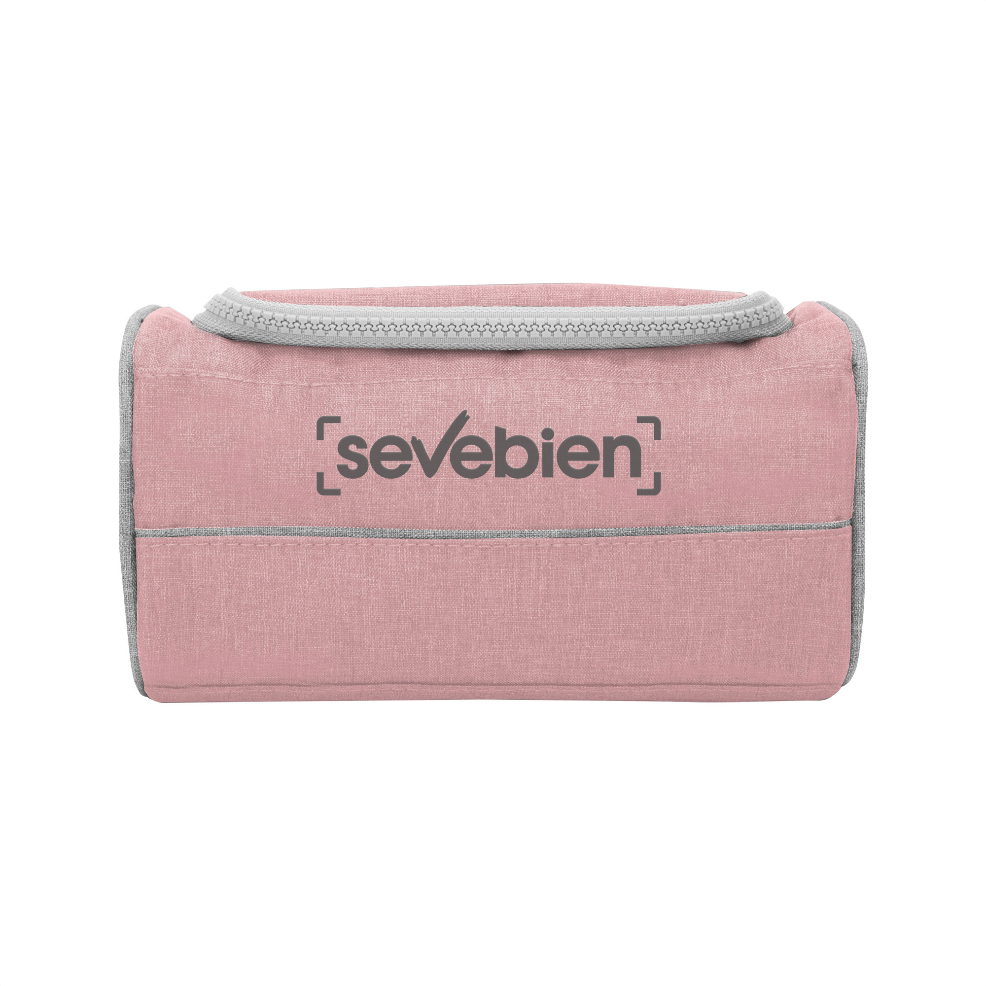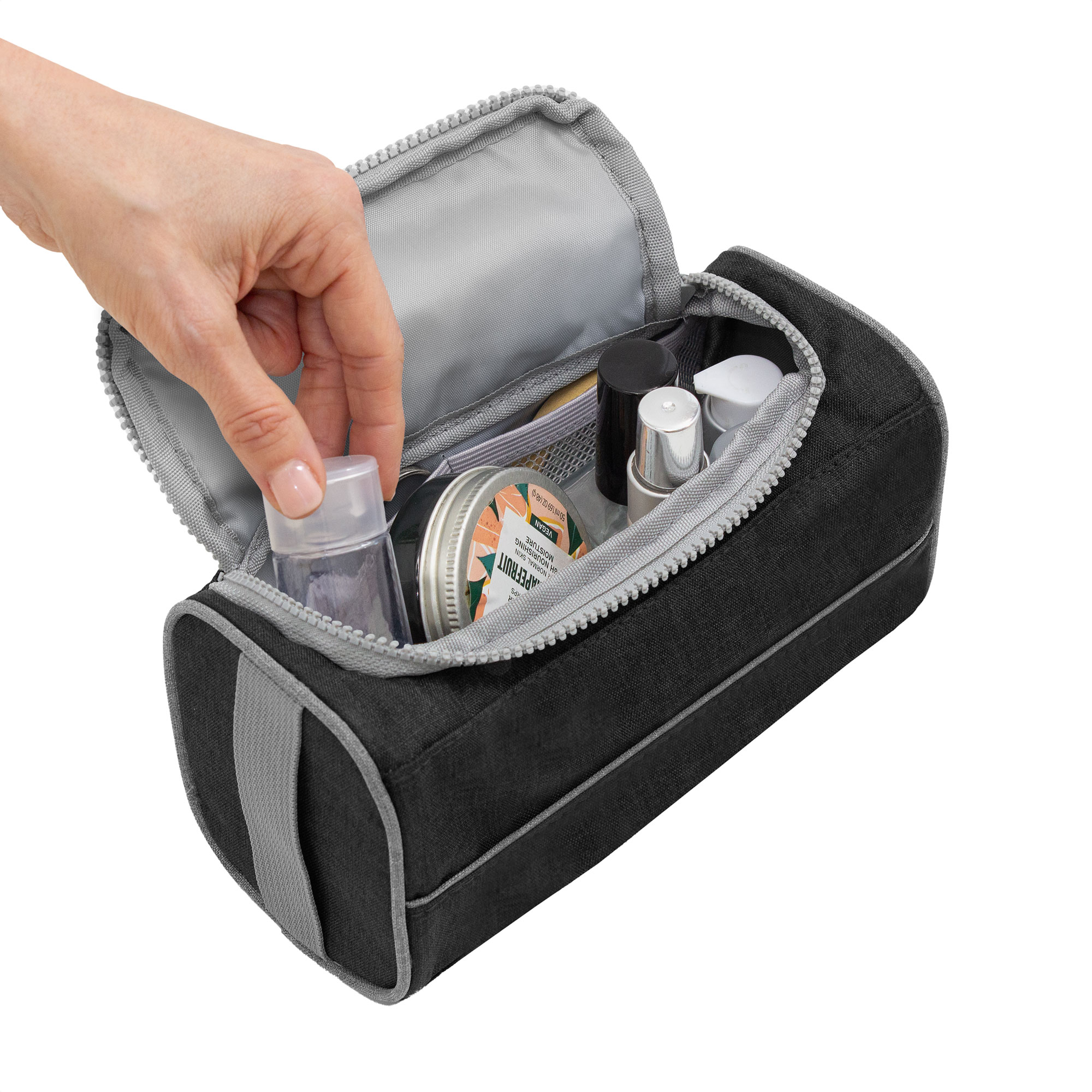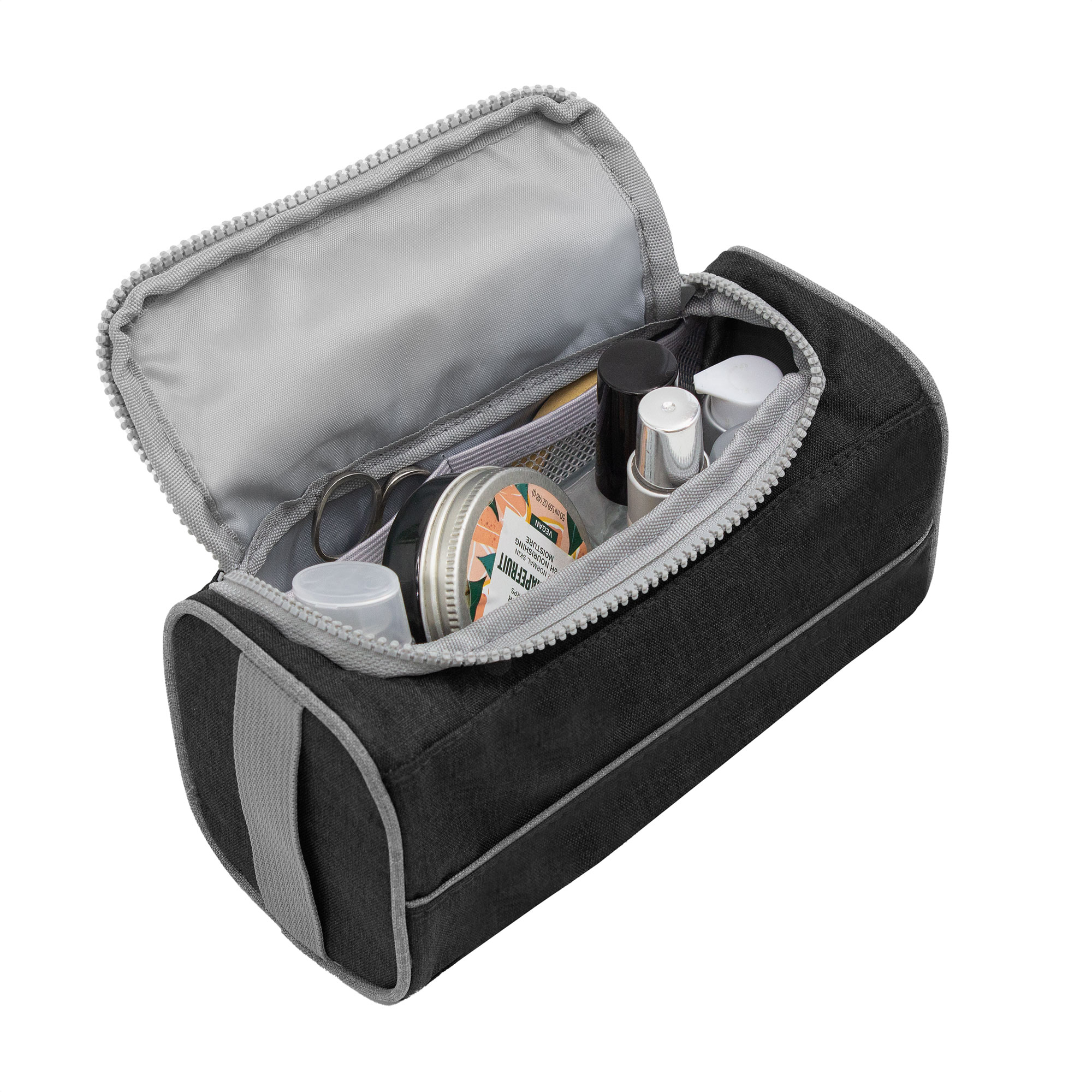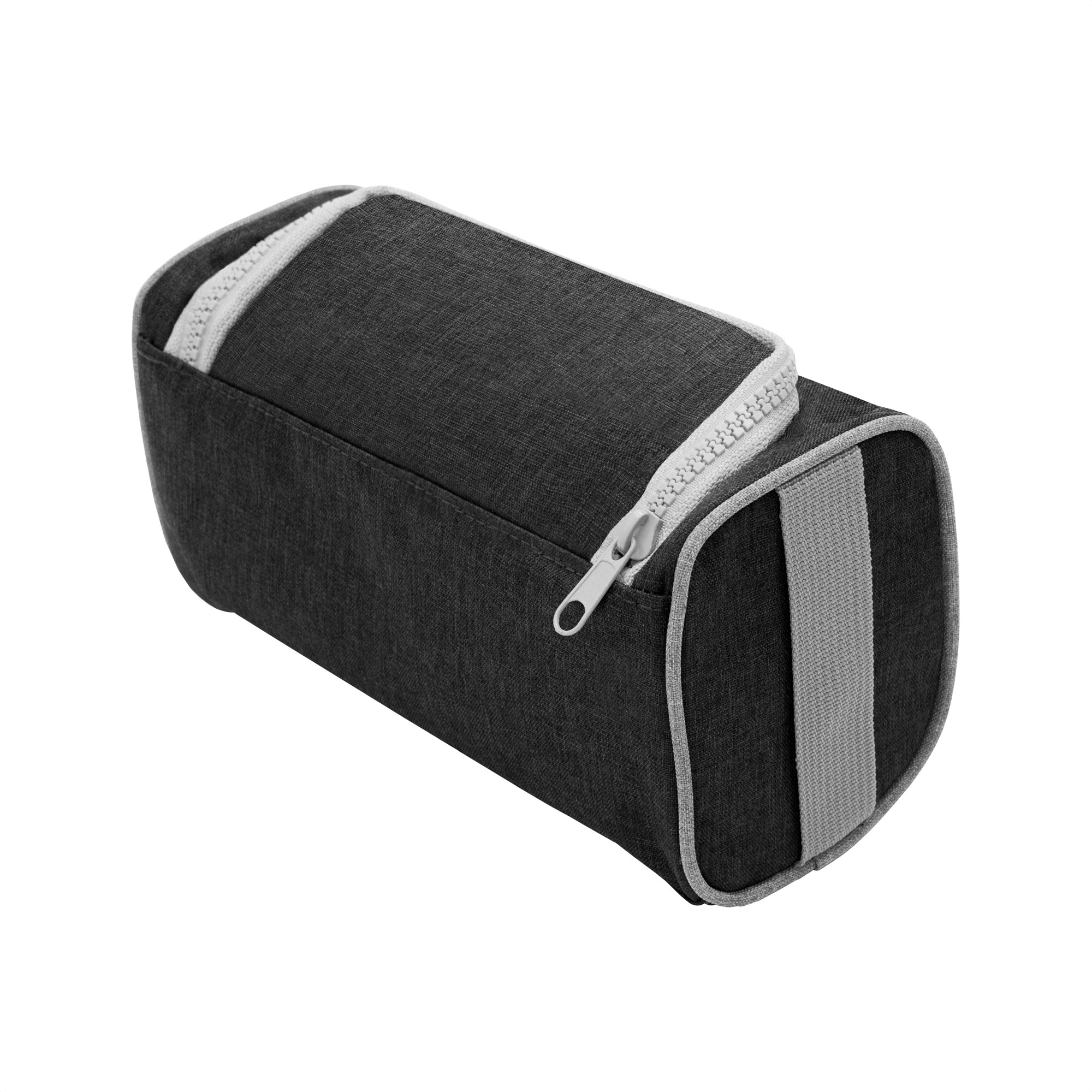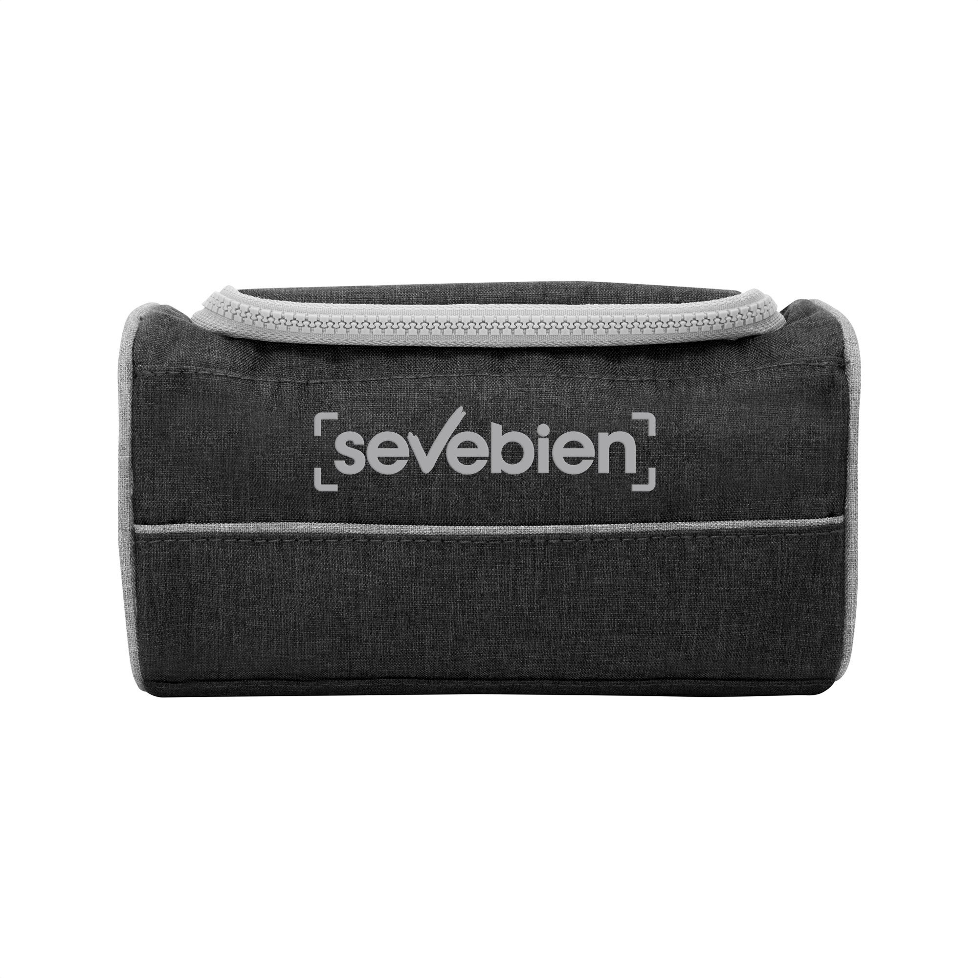 22 x 10 x 12 cm. Poliéster 300D bicolor. Necessaire con tapa. Organizador con dos bolsillos internos de red elastizados, tapa acolchada con cierre plástico color gris y asa lateral de tela color gris para transportar.