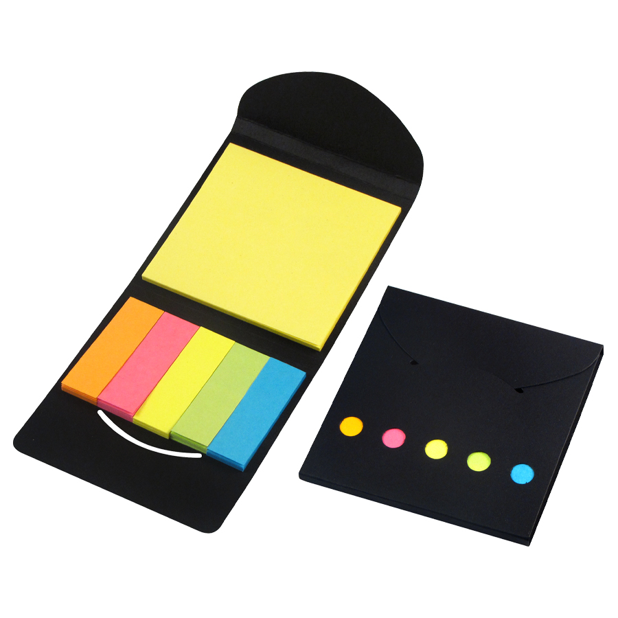 Porta Notas Adhesivas Ecológico de Cartón reciclado. Incluye 1 taco de notas adhesivas de 25 hojas de 7,5 x 7,5 cm + 5 tacos de 25 banderitas adhesivas de 5 x 1,5 cm.