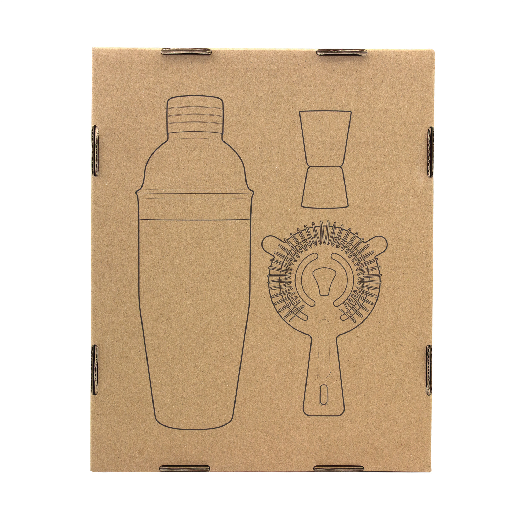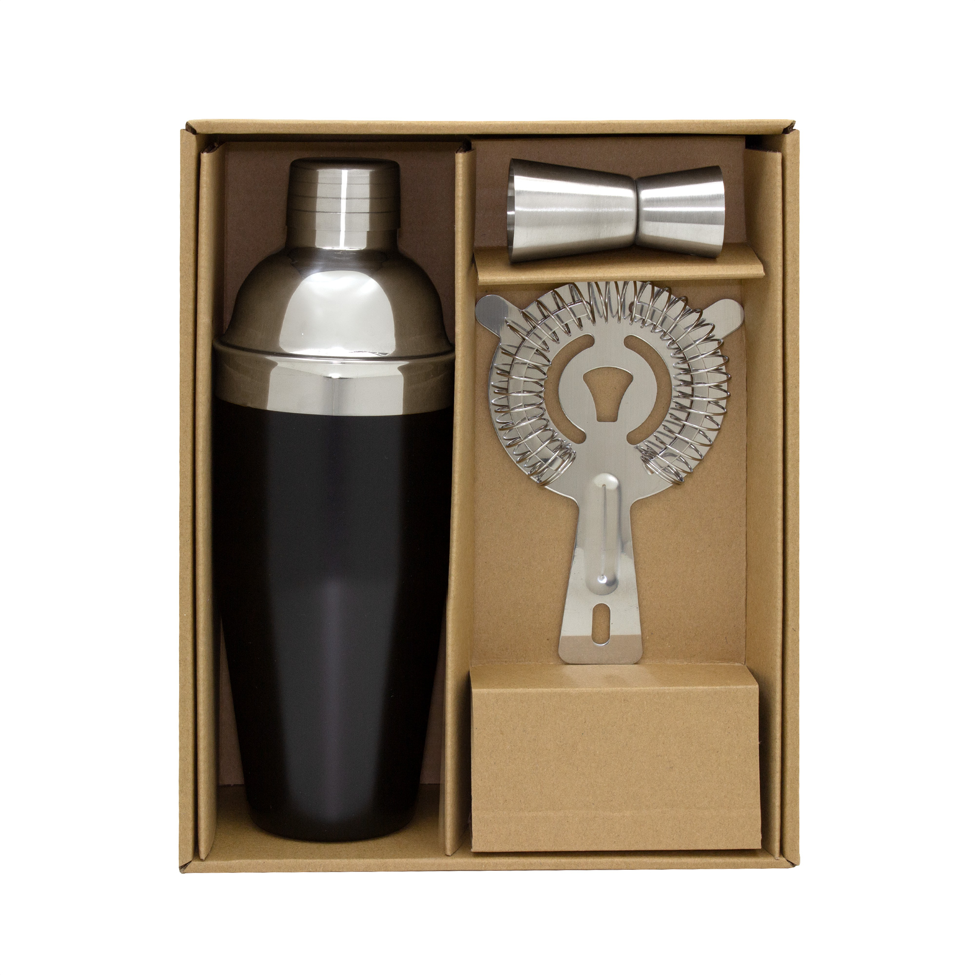 Acero inoxidable. Bartender Kit de tres piezas: Coctelera (Shaker) Ø 8 x 23,8 cm. Capacidad 600 ml. Vaso mezclador en acero 202 con acabado negro mate y tapa con colador incorporado. Medidor (Jigger) Ø 3,7 x 6,9 cm. Capacidad 30/15 ml. (1 y 1/2 oz) en acero 202. Colador oruga/gusanillo 14 x 9,5 cm. en acero 430. Presentacion en caja de regalo kraft.