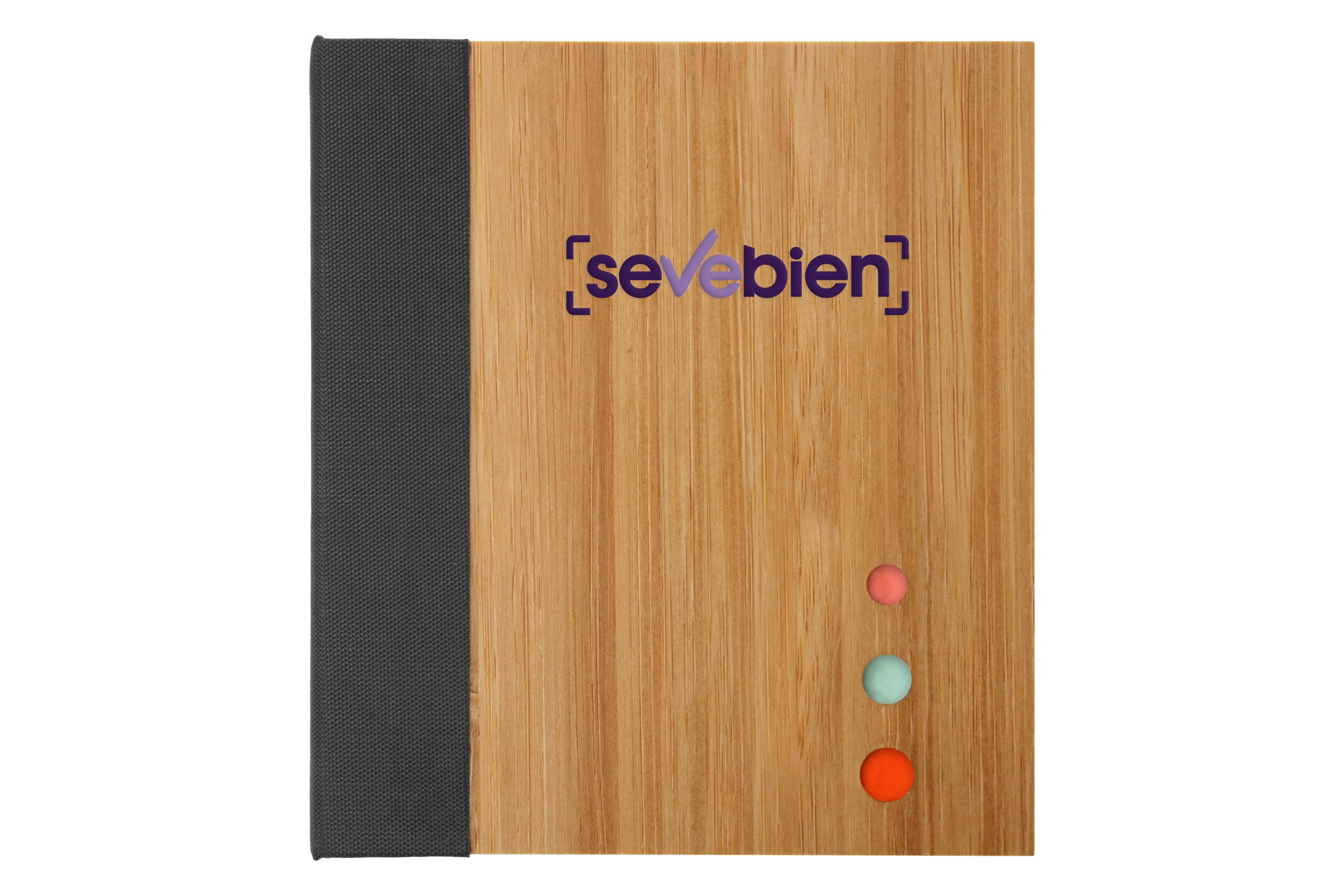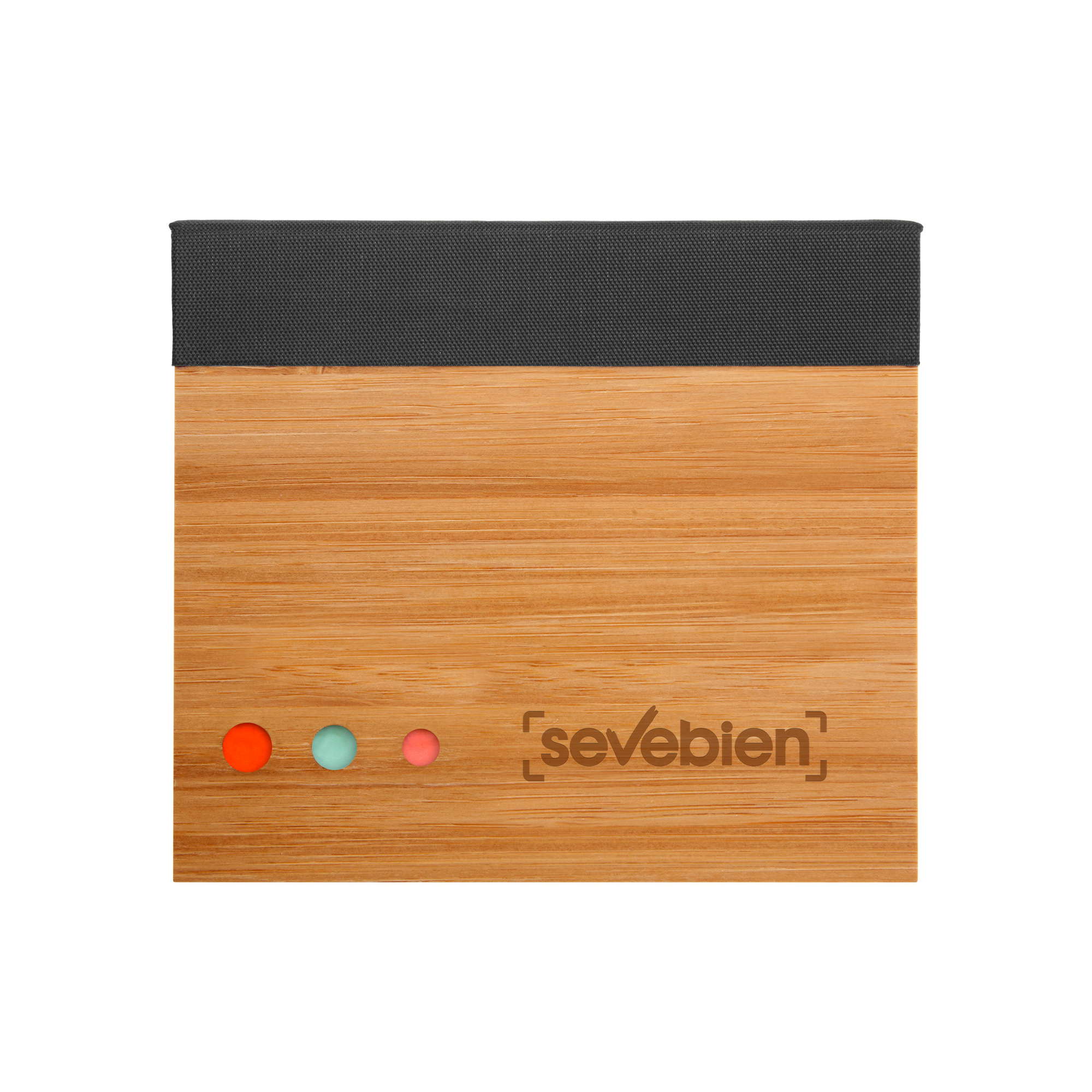 12 x 10,5 x 2 cm. Bambú. Contiene un bloc adhesivo rectangular de papel reciclado, un block adhesivo pequeño de color y 3 blocs en forma de flecha. El exterior del estuche es de bambú con detalles de tela, el interior es de plástico con divisiones. Presentación en caja de regalo.
