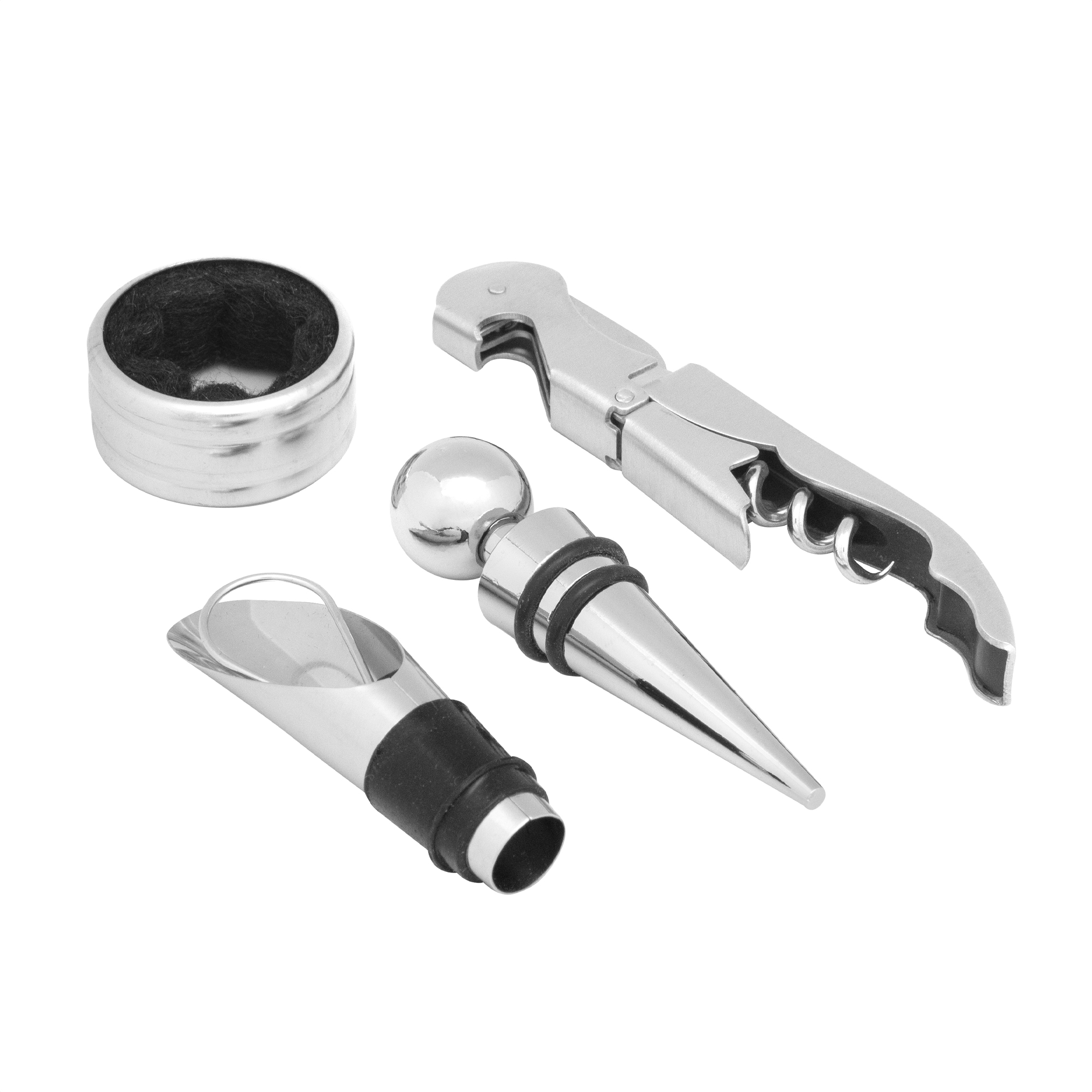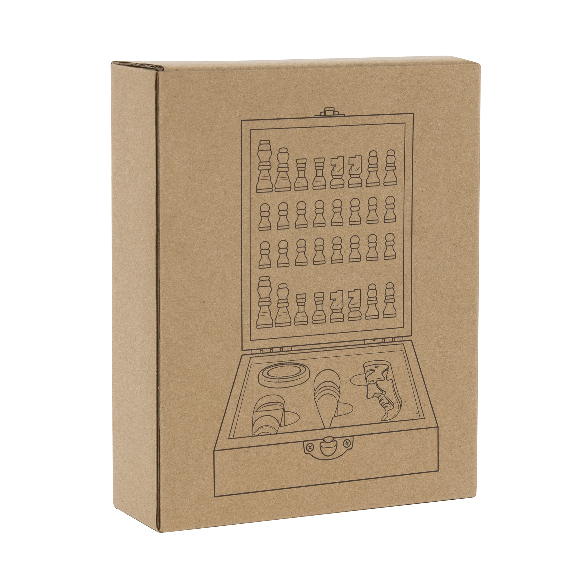 17 x 14 x 4,5 cm. Bambú, madera y acero inoxidable. Set de vino de 4 piezas (sacacorchos, anillo antigoteo, tapón y vertedor) con juego de ajedrez. Caja contenedora en bambú con piezas de ajedrez en madera. Abridor de acero inoxidable 420. Anillo de acero inoxidable 210. Tapón con aleación de zinc y aluminio. Vertedor de acero inoxidable 201 + silicona. Presentación en caja de regalo kraft.