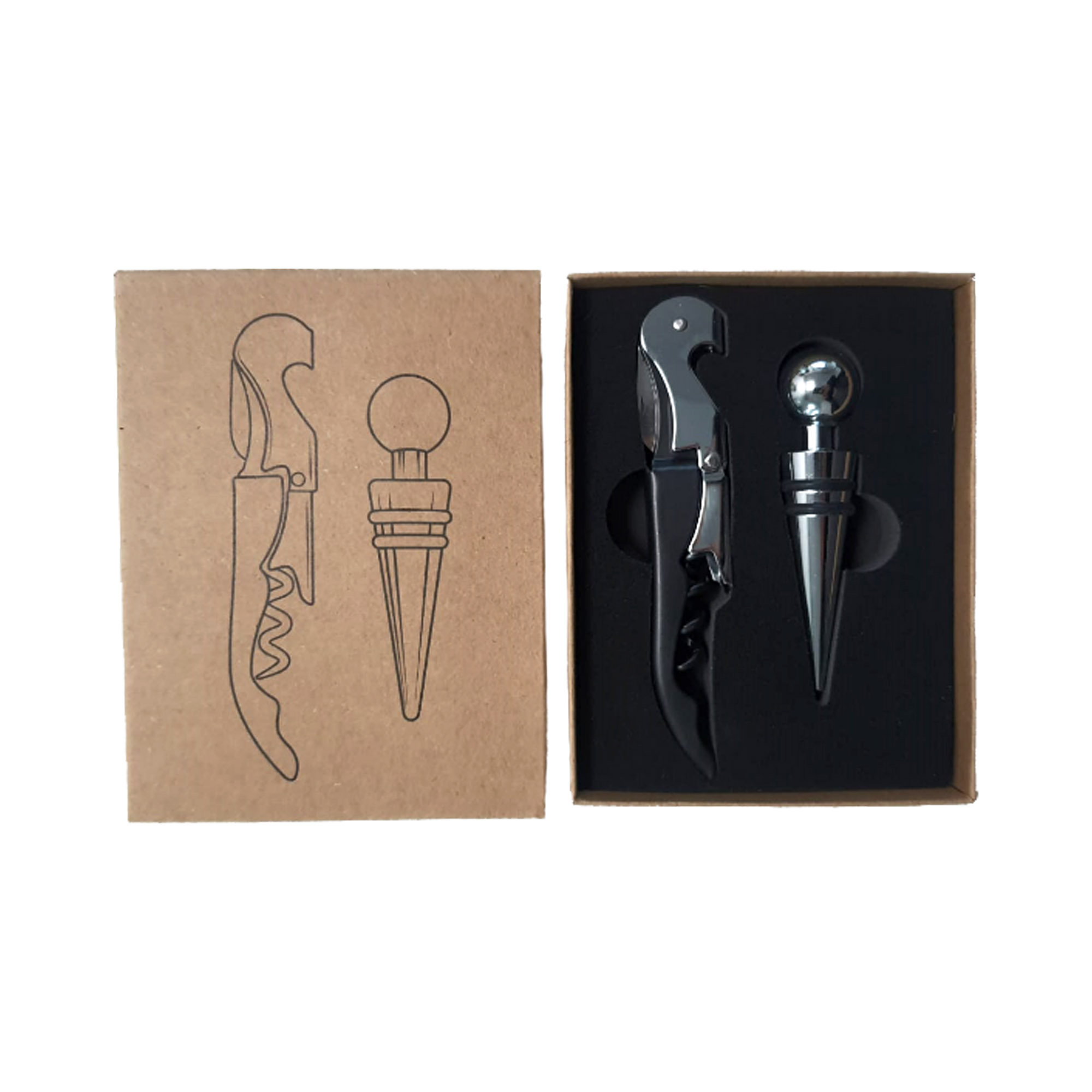 13 x 10 x 2,5 cm. Metal. Accesorios para vinos. Sacacorcho y tapón de metal. Estuche de cartón. Presentación en caja de regalo.