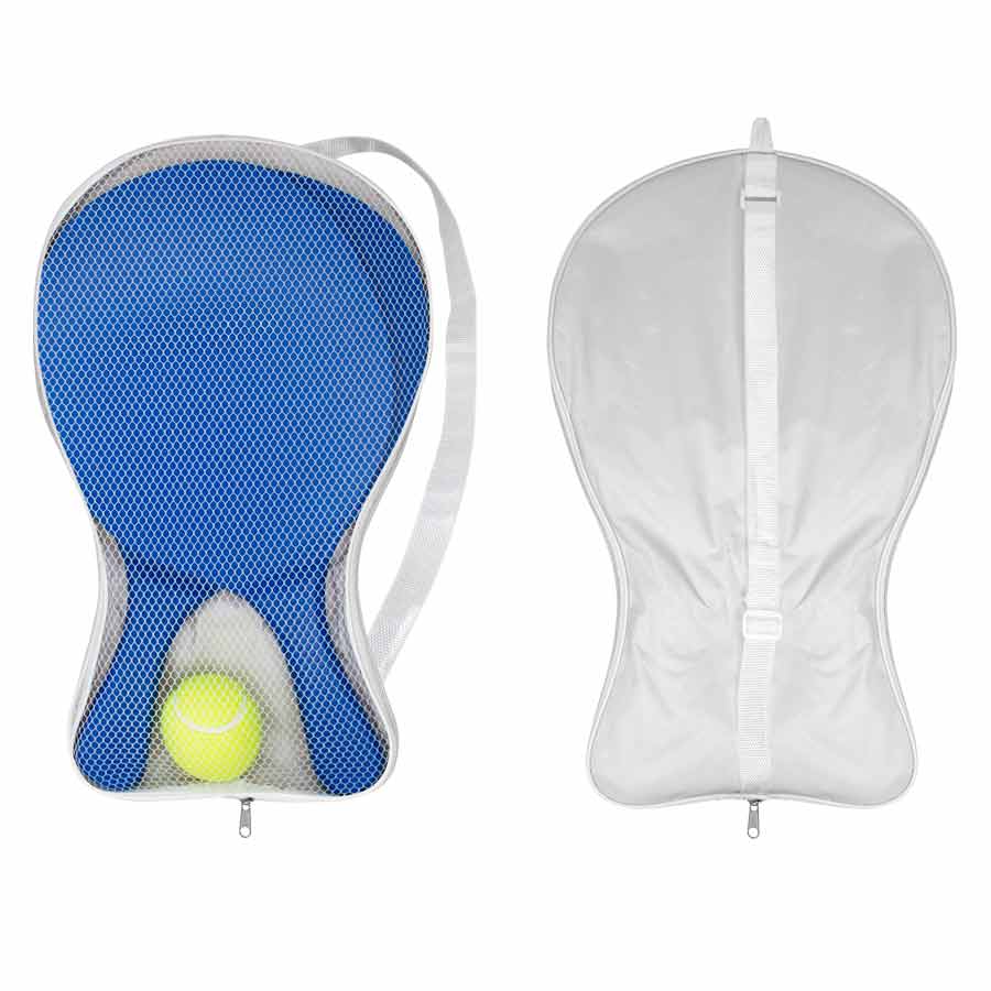 Set de Paletas de Playa de MDF esmaltado de 12mm. de espesor, modelo «Premium». Incluye bolso de tela poliéster blanco con frente malla y cinta para colgar + pelota de tenis amarilla. Cada paleta viene dentro de bolsa de polietileno.