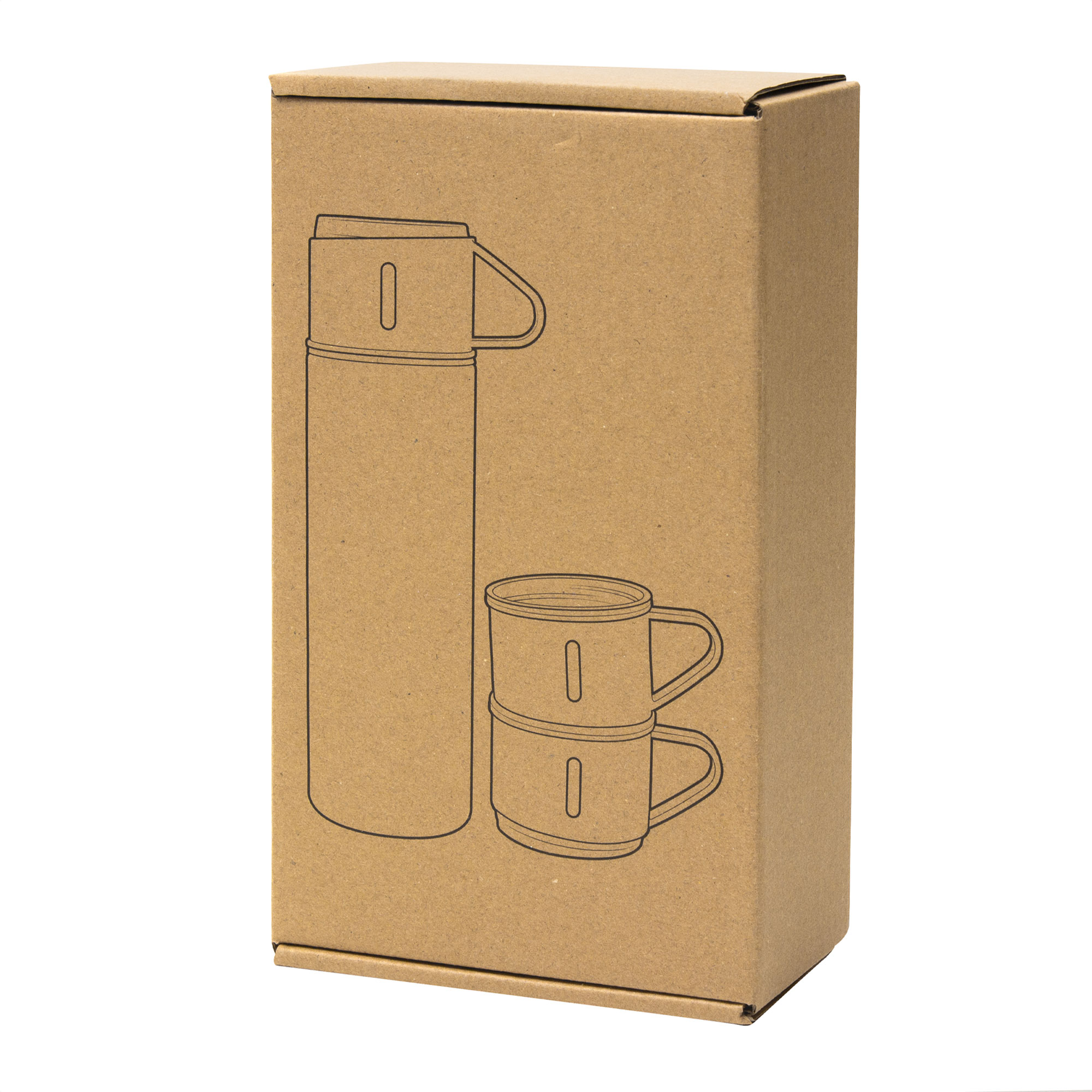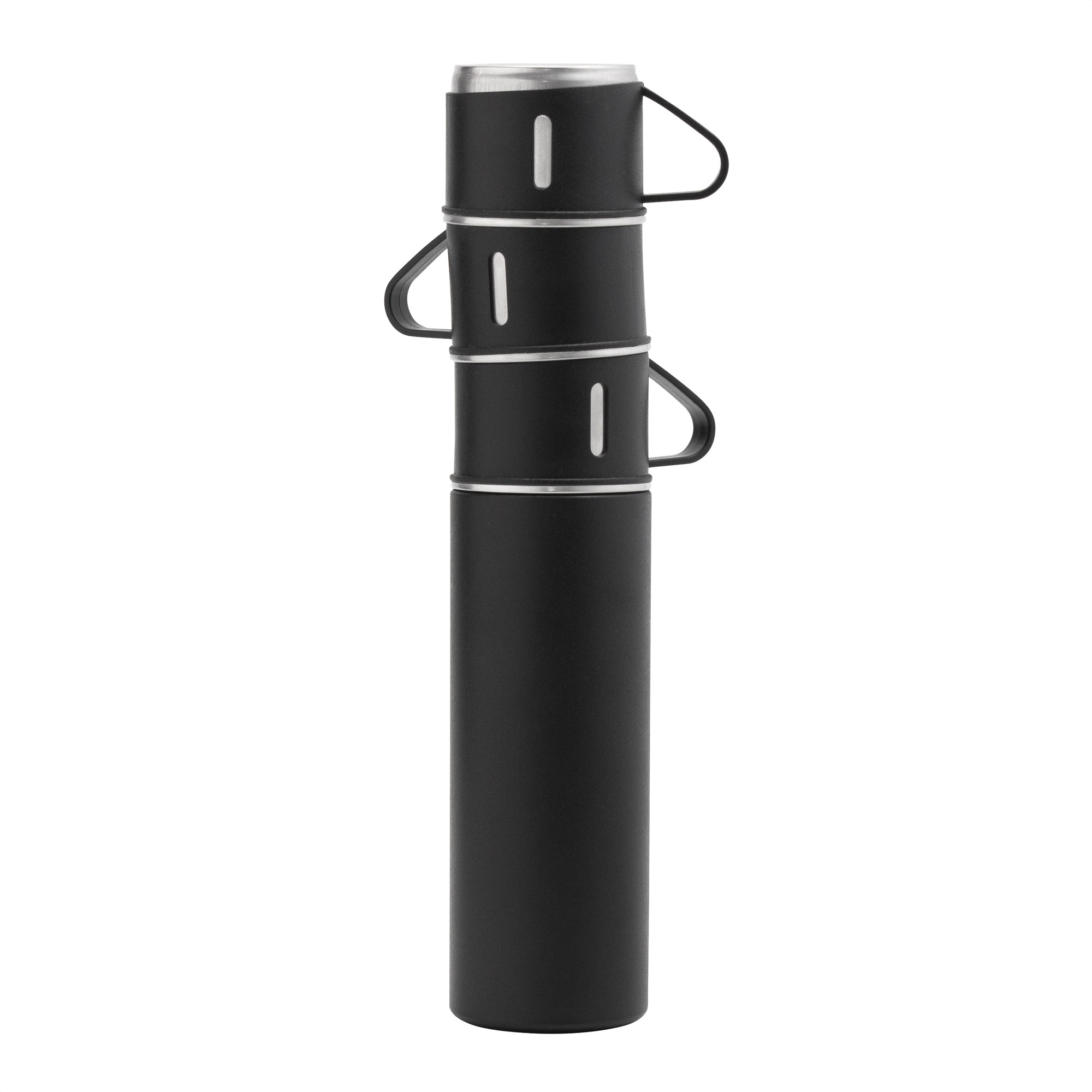 Ø 6,5 cm x 23,5 cm. Acero inoxidable y Polipropileno. Capacidad 500 ml. Set de termo y tres tazas. Termo con doble pared sellado al vacío. Acero inoxidable 304 interior / 201 exterior. Tapa y tazas Ø 6,5 cm x 5 cm. Capacidad 120 ml. Acero inoxidable 304 interior / Polipropileno exterior. Pintura acabado mate. Mantiene por más de 12 hs la temperatura de las bebidas calientes y 24 hs de las bebidas frías. Presentación en caja de regalo Kraft.
